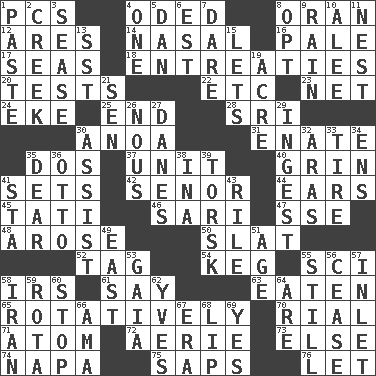 ACROSS 1. Personal Computers (abbr.) 4. Wrote a lyric poem 8. NW Algerian seaport 12. Ancient Greek god of war 14. Relating to the nose 16. Light colored 17. Oceans 18. Pleas 20. Trials 22. And so on (abbr.) 23. Remaining after all deductions 24. Make supply last 25. Conclusion 28. Indian title of respect (Mr.) 30. Small Philippine buffalo 31. Maternal 35. Two (Sp.) 37. A single undivided whole 40. Smile widely 41. Arranges properly for use 42. Sir (Sp.) 44. Hearing organs 45. Jacques of French films 46. Indian skirt 47. Compass dir. 48. Came up 50. Narrow board 52. Label 54. Cask 55. _-fi 58. Big collection agency 61. Declare 63. Eroded 65. Producing rotation 70. Monetary unit of Yemen 71. Tiny particle 72. Nest on high 73. Otherwise 74. California wine valley 75. Plant excrements 76. Allow DOWN 1. Thick mixture 2. Small stream 3. Gospel singer Marvin 4. Single 5. One of the 12 tribes of Israel 6. Eastern Standard Time (abbr.) 7. Have the gumption 8. Elect 9. Precipitation 10. Toward shelter 11. Egg locale 13. Fast jet (abbr.) 15. Allows 19. Measure of real estate 21. Elected rep. 26. Good sense 27. Natives or inhabitants of Denmark 29. Consume 30. Help 32. Ancient river in northeast Turkey 33. Become fatigued 34. Followers of ems 35. Letter starter 36. "Beetle Bailey" pooch 38. _ tizzy (2 wds.) 39. Cod relative 41. R.R. building 43. Cause heat under the collar 49. Compass direction 51. Grow older 53. Greek goddess of the earth (variant) 55. Not moving 56. Stop 57. An arm off of a larger body of water 58. SW Asia republic 59. Round or rotation of duties 60. Discontinue 62. Jacques Cousteau's middle name 64. "We ___ not amused" (Victoria) 66. Wet nurse (var.) 67. Period 68. Mouth edge 69. Consenting reply