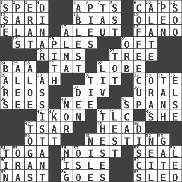 ACROSS 1. Broke a traffic law 5. Flats, for short 9. Smile enhancers 13. Indian skirt 14. Prejudice 15. Butter sub 16. Style 17. Eskimo relative 18. Papal veil 19. Paper fasteners 21. Often (poetically) 22. Basketball hoops 23. Relationship diagram 24. Sound made by sheep 27. Make lace 28. Ear part 29. Assad's deity 31. Teat (slang) 32. ____ d'Azur (French Riviera) 36. Vintage cars 37. HTML Container Element 38. Mountain range 39. Observes 40. Born 41. Connects, as a bridge 42. Visual representation of an object 44. Affectionate concern, for short 46. A female animal or person 47. Russian ruler of old 48. Froth on beer 50. Baseball player Mel 51. Inhabiting a nest 54. Ancient Roman robe 56. Wet 58. Lick closed 60. SW Asia republic 61. Capri or Wight 62. Quote 63. Political cartoonist Thomas 64. Travels 65. Downhill vehicle DOWN 1. Compass dir. 2. Friends 3. Part of Q.E.F. 4. Middle Eastern gold or silver currency 5. Most capable 6. Sliced desserts 7. The 19th letter of the Greek alphabet 8. Fast jet (abbr.) 9. Java holder (2 wds.) 10. Having winglike extensions 11. Animal enclosure 12. "Barney Miller" actor Jack 17. _ mater 20. Essential or central part 21. Globe 23. Small child 24. Drinking establishments 25. Toward shelter 26. Medicinal plant 28. 54 in ancient Rome 30. Aide 31. Neckwear 33. Mouths or openings 34. Hyperbolic tangent 35. Otherwise 37. Lair 40. And not 41. Scram, to a cat 43. Krazy ___ of comics 44. College papers 45. For fear that 47. Ancient Roman robes 49. Plates 51. Mediterranean tributary 52. Famous astronaut Armstrong 53. Yard entry 54. Metal container 55. Mouth or opening 56. Russian fighter aircraft 57. Bear (Spanish) 59. Directed