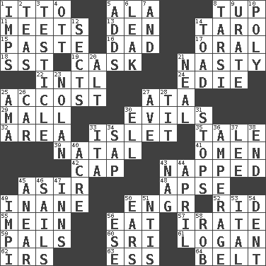 ACROSS 1. "Tell ____ the Marines!" 5. According to 8. Uncastrated adult male sheep 11. Confronts 13. Lair 14. Pacific island yam 15. Thick mixture 16. June honoree 17. Spoken 18. Fast jet (abbr.) 19. Keg 21. Thoroughly unpleasant 22. International (abbr.) 24. Singer Brickell 25. Buttonhole 27. "One Day ___ Time" 29. Shopping center 30. Vices 32. Type of rug 33. Small island 35. Lie 39. Brizilian seaport 41. Sign of something about to happen 42. Head covering 43. Slept 45. SW Saudi Arabia district 48. Domed church section 49. Empty; void 50. Engineer (abbr.) 52. To free from 55. Count _ (2 wds.) 56. Erode 57. Feeling or showing extreme anger 59. Friends 60. Indian title of respect (Mr.) 61. Utah city north of Ogden 62. Big collection agency 63. Double-curved letter 64. Waist strap DOWN 1. Naughty children 2. Beverages made from leaves 3. A testis 4. Baseball player Mel 5. Does sums 6. Path through which fluid escapes 7. Plus 8. Tarsus (plural) 9. A salt of uric acid 10. More than one (prefix) 12. Religious groups 14. Frog relative 20. Keyboard modifier key 21. Actress Patricia 23. Pitcher Ryan 25. Nursemaid (var.) 26. 4-wheeled motor vehicle 27. "___ Maria" 28. Teat (slang) 30. Pipe bend 31. Constricts 33. Call ___ day 34. Plant excrement 36. Electrical Measurement 37. Area sheltered from the wind 38. Conclusion 40. Land measure 43. Tired old horse 44. Showery time 45. Approach 46. Moves on water 47. Taverns 49. Body of Kaffir warriors 50. Hearing organs 51. Nuclear Threat Initiatives 53. Slanted text style (abbr.) 54. Incision 56. Compass dir. 58. Director Reiner