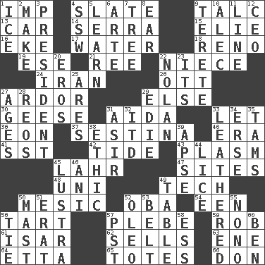 ACROSS 1. Naughty child 4. Chalkboard 9. Baby powder 13. 4-wheeled motor vehicle 14. Spanish missionary in California 15. Writer Wiesel 16. Supplement with great effort 17. Wetness 18. Former U.S. Attorney General Janet 19. Compass dir. 21. To sift 22. Sibling's daughter 24. SW Asia republic 26. Baseball player Mel 27. Zeal 29. Otherwise 30. Honkers 31. Opera by Verdi 33. Allow 36. Period of immesurable duration 37. French poetic form 40. Epoch 41. Fast jet (abbr.) 42. Periodic rise and fall of the sea level 43. Suffix with ecto or cyto 45. Cowardly lion portrayer 47. Settings 48. Corn or form start 49. Technical work 50. Mesonic 52. Chief or king in Benin or Nigeria 54. Car or cant ending 56. Small pie 57. Cadet 59. Director Reiner 61. Austrian river, tributary to the Danube 62. Exchanges for money 63. Compass dir. 64. Singer James 65. Lugs 66. Spanish title DOWN 1. Frozen water 2. Cause to be 3. Elected leader of a country 4. Compass dir. 5. Acquire or gain knowledge or skills 6. Johnson of "Laugh-In" 7. Relationship diagram 8. Ewer handle 9. Cigar-shaped 10. Actor Baldwin 11. Actor's bit 12. Corporate head (abbr.) 20. Greek god of love 22. Pitcher Ryan 23. ___ a Wonderful Life 25. Ancient Greek god of war 27. Ripens 28. Vintage cars 29. Singer Brickell 31. SW Saudi Arabia district 32. It would 33. Tough but pliablecoriaceous 34. Celtic language 35. Scottish caps 38. Moral principle 39. Domed church section 44. Louse (plural) 45. A period of five years 46. Black tropical American cuckoo 49. Eating place 50. Vertical spar for supporting sails 51. Part of Q.E.F. 52. Margarine 53. Waist strap 55. Words to Nanette 56. Neckwear 57. Pacific Standard Time (abbr.) 58. Double-curved letter 60. Benjamin's nick name