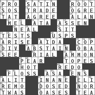 ACROSS 1. Adept person 4. Smooth fabric 9. Carrot, for example 13. Distress signal 14. Barter 15. Legendary monster 16. Make lace 17. Match 18. Actor Alda or Thicke 19. Cartoonist voice _ Blanc 21. _ moment's notice (2 wds.) 22. NE Netherlands city 24. Be tempered by heat 26. Be seated 27. Trials 29. United States Postal Service (abbr.) 30. Originate 31. Opera by Verdi 33. Police officer (slang) 36. HTML Container Element 37. Choose not to consume 40. Chief or king in Benin or Nigeria 41. Observe 42. Monetary unit of Yemen 43. ID or VA city 45. Lightbulb-shaped fruit 47. Drinks excessively 48. Being at a high temperature 49. Make new 50. Soft thread for cleaning between teeth 52. White ___ sheet 54. Followers of ems 56. Set down 57. Silly 59. Biblical high priest 61. San ____ (Riviera town) 62. Administered medicine 63. Or not 64. It was, poetically 65. Fertile tracts in a desert 66. Beverage made from leaves DOWN 1. Pacific Standard Time (abbr.) 2. Wander 3. Clearly or manifestly demonstrative 4. R.R. building 5. Therefore, facetiously 6. Small pie 7. The main thing one is thinking about 8. Born 9. Cooks with dry heat, as in an oven 10. Stare 11. Northwest Algerian city 12. "___ Little Indians" 20. Allows 22. Slender Brazilian palm 23. Small drink 25. Toward the sea 27. Small amounts or degrees 28. One of the Great Lakes 29. Freehold land 31. SW Saudi Arabia district 32. Call ___ day 33. Piece 34. Mitch Miller's instrument 35. Zero-star reviews 38. Naughty children 39. Nathan's nickname 44. Method 45. Pictures 46. Greek goddess of the dawn 49. Indian princess (variant) 50. Soared 51. Pale green bean 52. Small Philippine buffalo 53. Backtalk 55. A type of plum 56. Tate display 57. Wedding promise 58. Begley and Asner 60. Retirement account (abbr.)