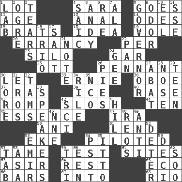 ACROSS 1. Car dealer's back yard 4. "Two Mules for Sister ____" 8. Travels 12. Personal question 13. Of or related to the anus 14. Lyric poems 15. Naughty children 18. It may be bright or harebrained 19. Short-tailed, large-bodied rat 20. Tendancy to err 22. For each 23. Grain storage tower 24. Slender fish 25. Baseball player Mel 26. Pre-World Series prize 30. Allow 33. Bert's buddy 36. Mitch Miller's instrument 37. Mouths or openings 39. Frozen water 40. To erase 41. Frolic 42. Make a splashing sound 44. Nine, plus one 45. Center 47. Retirement account (abbr.) 50. Black tropical American cuckoo 51. Grant temporary use of 53. Make supply last 54. Manned the helm 57. Not wild 59. Trial 61. Settings 63. SW Saudi Arabia district 64. Take ten 65. Environmental prefix 66. Soap units 67. To the inside or interior of 68. River (Sp.) DOWN 1. Experiment locale 2. Legendary monster 3. Lacerates 4. Ketch in the Levant 5. "60 Minutes" Commentator Rooney 6. Actress Charlotte 7. In the manner of 8. Head of state? 9. Aroma 10. Snakelike fish 11. Compass dir. 16. Musical group of three 17. Table seasoning 21. Brief written record 22. Baking dish 24. Unit of force equal to gravity 26. Sliced desserts 27. Blind as ____ 28. Sense of smell 29. Adolescent 30. Old wives' tales, e.g. 31. Greek god of love 32. Scottish caps 34. Cause heat under the collar 35. Non-commissioned officer (abbr.) 38. Orators 42. _-fi 43. Land elevation 46. Compass dir. 48. Vintage cars 49. Against 52. Prevent from occurring 53. Independent ruler or chieftain 54. Inconspicuous attention getter 55. "Tell ____ the Marines!" 56. Tenth: prefix 57. Keyboard key 58. White ___ sheet 59. Three (prefix) 60. Car or cant ending 62. "Barney Miller" actor Jack