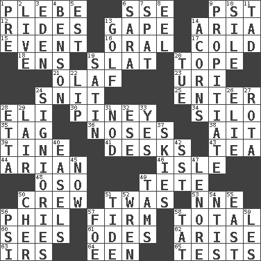 ACROSS 1. Cadet 6. Compass dir. 9. Pacific Standard Time (abbr.) 12. Amusement-park features 13. Yawn 14. Operatic vocal solo 15. Incident 16. Spoken 17. Chilled 18. Followers of ems 19. Narrow board 20. Drink excessively 21. Norwegian king 23. RI univ. 24. In a ____ (agitated or irritated) 25. Keyboard key 28. Biblical high priest 30. Abounding in pines 34. Grain storage tower 35. Label 36. Olfactory organs 38. Small island 39. Prong on a fork 41. Writing tables 43. Afternoon social gathering 44. Believer in; advocate of (suffix) 46. Capri or Wight 48. Bear (Spanish) 49. Wig 50. Group working together 51. It was, poetically 53. Compass dir. 56. Silvers or Donahue 57. Become taut 58. Add up to 60. Observes 61. Lyric poems 62. Originate 63. Big collection agency 64. Car or cant ending 65. Trials DOWN 1. Before (prefix) 2. Moving, as bait 3. Locale of original sin 4. Gillaume's butler role 5. Eastern Standard Time (abbr.) 6. "Two Mules for Sister ____" 7. Argument over a trivial matter 8. Snakelike fish 9. Conciliate 10. Drop; flow; fall 11. Bit 13. _ course 14. Oak nuts 19. Smooth fabric 20. Third day of the wk. 22. Mouth edge 24. Seigniories (variant) 26. Writer Wiesel 27. Round or rotation of duties 28. Singer James 29. Den 31. Allow head to fall sleepily 32. Compass dir. 33. Consenting reply 37. Atmospheres 40. Artist's stands 42. Fast jet (abbr.) 45. Immediately 47. Poe poem 49. Scottish caps 50. "Mermaids" star 51. Periodic rise and fall of the sea level 52. Songbird 54. Nuclear Threat Initiatives 55. Compass direction 56. 23rd letter of the Greek alphabet 57. Enemy 58. Make lace 59. French article