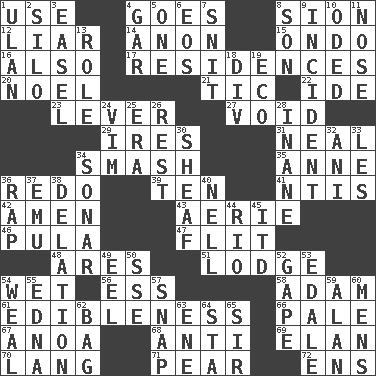 ACROSS 1. Purpose 4. Travels 8. The Jewish people; Israel 12. One who doesn't tell the truth 14. Soon (poet.) 15. Southwest Nigerian state 16. In addition 17. Homes 20. Christmas carol 21. Nervous spasm 22. Binary compound 23. Crowbar 27. Null 29. Angers 31. Actress Patricia 34. Box-office sellout 35. Singer Murray 36. Do over again 39. Nine, plus one 41. Nuclear Threat Initiatives 42. So be it 43. Nest on high 46. Monetary unit of Botswana 47. Secret move to avoid paying debts 48. Ancient Greek god of war 51. Cabin 54. Soggy 56. Double-curved letter 58. First of billions? 61. The property of being fit to eat 66. Diluted with white 67. Small Philippine buffalo 68. Against 69. Style 70. Long (Scottish) 71. Lightbulb-shaped fruit 72. Followers of ems DOWN 1. ____ Bator 2. Grain storage tower 3. Artist's stand 4. Slender fish 5. Single 6. Greek goddess of the dawn 7. In a ____ (agitated or irritated) 8. Male child 9. Event 10. Wrote a lyric poem 11. Olfactory organ 13. Hero or heavy, e.g. 18. HTML Container Element 19. Environmental prefix 24. Zeal 25. Period 26. Relief 28. Silly 30. To gather and bind into a bundle 32. Cuckoo 33. French article 34. Echolocation 36. Strike 37. Australian flightless bird 38. Conveyance 40. 1994 drama film starring Jodie Foster 44. _ de Janeiro 45. It would 49. Snakelike fish 50. Compass dir. 52. Yawn 53. Peak District village in England 54. Welt 55. Pulitzer Prize-winning author Ferber 57. Fastener 59. Actor Alda or Thicke 60. Not women's 62. Paper or plastic container 63. Compass dir. 64. R.R. building 65. Title for a knight