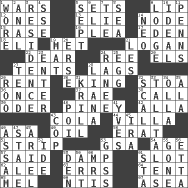ACROSS 1. Armed conflicts 5. Arranges properly for use 9. Mouth edge 12. Singles 13. Writer Wiesel 14. Thickened enlargement 15. Raze (variant) 16. Entreaty 17. Genesis locale 18. Connecticut Ivy Leaguer 19. Was introduced to 21. Utah city north of Ogden 22. Letter starter 24. To separate or throw off 26. Raised railways 27. Portable shelters 28. Fails to keep up a pace 29. Monthly bill 30. Supplementing with great effort 32. Portico 36. At one time in the past 37. Actress Charlotte 38. Give a ring to 39. Baltic tributary 40. Abounding in pines 42. Silent film actress Nazimova 43. Root beer relative 44. Country residence 46. White ___ sheet 49. Lubricate 50. Part of Q.E.F. 51. Remove all contents or possession from 53. Girls' org. (abbr.) 54. Personal question 57. Stated 58. Moist 61. Slit 62. Toward shelter 63. Blunders 64. Portable shelter 65. Cartoonist voice _ Blanc 66. Nuclear Threat Initiatives 67. Toward the sea DOWN 1. Had on 2. Of or related to the anus 3. Home 4. Compass dir. 5. Back-to-school mo. 6. Pipe bend 7. Neckwear 8. Ocean 9. Cabin 10. Perfect 11. Actor Sean's family 14. Modern: prefix 19. Floor covering 20. Celtic language 21. French article 23. Keyboard key 24. Indian princess (variant) 25. Ovum 27. Look after 28. Woody, climbing, usually tropical plant 29. Friend of Pooh 31. Shrimp-like planktonic crustaceans 32. Any of the three canals of the cochlea 33. Baron Munchausen's specialties 34. Spanish pot 35. Chicken ___ king 40. Luau course 41. Jacques Cousteau's middle name 43. Police officer (slang) 45. Lyricist Gershwin 46. Indian state 47. Having lost freshness 48. Satellite of Uranus 52. Binary compound 53. Global Positioning Systems (abbr.) 55. Went 56. Singer James 58. Lair 59. Nonscientific branch of learning 60. Medical imaging device (abbr.) 61. R.R. building