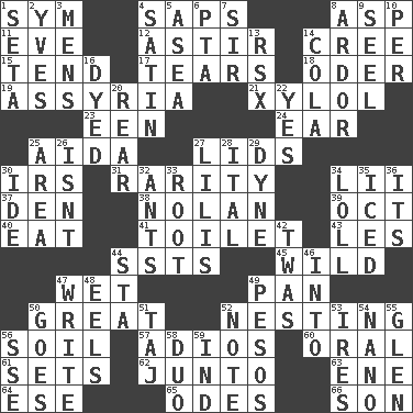 ACROSS 1. Symbol (abbr.) 4. Plant excrements 8. Viper 11. First lady 12. Being in motion 14. Algonquian 15. Be inclined (to) 17. Rends 18. Baltic tributary 19. Nineveh was its capital 21. Xylene (variant) 23. Car or cant ending 24. Ewer handle 25. Opera by Verdi 27. Flaplike coverings 30. Big collection agency 31. Noteworthy scarcity 34. Cards in a Roman deck? 37. Lair 38. Pitcher Ryan 39. Sep. follower 40. Ingest 41. Bathroom 43. French article 44. Fast planes 45. Rampant 47. Soggy 49. Baking dish 50. Relatively large 52. Nestling 56. Earth 57. Goodbye (Sp.) 60. Relating to the mouth 61. Puts into a specified state 62. Secret group 63. Compass dir. 64. Compass dir. 65. Lyric poems 66. Male offspring DOWN 1. Stalk of a moss capsule 2. Jacques Cousteau's middle name 3. Not women's 4. Smooth fabric 5. At sea 6. Parent Teacher Assoc. 7. Title for a knight 8. Zeal 9. Stitch closed the eyes of (a falcon) 10. For each 13. Acura sports coupe 14. Root beer relative 16. Colored 20. Rump 22. Affirmative reply 25. Length times width 26. Is not 27. Ms. Damita and namesakes 28. Slanted text style (abbr.) 29. Unit of force 30. Binary compound 32. Pismires 33. Carrot, for example 34. Hang loosely or laxly 35. On the rocks 36. ___ a Wonderful Life 42. It was, poetically 44. R.R. building 46. To the inside or interior of 47. Compose 48. Snakelike fish 49. Mexican monetary units 50. Leaves 51. _ Mahal 52. Make mention of 53. Angers 54. Billionth: prefix 55. Small, secluded valley 56. Compass dir. 58. Superhero pair 59. Working for oneself (abbr.)