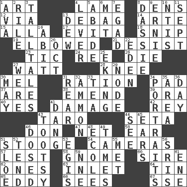 ACROSS 1. Nonscientific branch of learning 4. Unable to walk 8. Cub Scout units 12. By way of 13. Debunk (Brit. slang) 14. Johnson of "Laugh-In" 15. Silent film actress Nazimova 17. Webber/Rice musical 18. Clip 19. Shoved, as through a crowd 21. Cease 23. Nervous spasm 24. To separate or throw off 26. Expire 27. Electrical Unit 28. Leg joint 30. Cartoonist voice _ Blanc 31. Food allowance for one day 34. Writing tablet 37. "We ___ not amused" (Victoria) 38. Make improvements or corrections to 39. Mouth or opening 40. Consenting reply 41. Break 42. Marina Del _, California 43. Edible starchy tuberous root 44. Bristle 46. Spanish title 47. Fish or hair follower 50. Hearing organ 51. Moe Howard, for one 54. Devices for capturing images 57. For fear that 58. Dwarf 60. The founder of a family 62. Singles 63. An arm off of a larger body of water 64. Metal container 65. Whirlpool 66. Perceives with the eye 67. Compass dir. DOWN 1. Actress Gardner 2. Cause heat under the collar 3. Baron Munchausen's specialties 4. Crowbar 5. Stay 6. Floor protector 7. Mild oath 8. Small ungulate mammals of Africa 9. Bert's buddy 10. Nuclear Threat Initiatives 11. Back-to-school mo. 13. Morning condensation 16. "This won't hurt ____!" 20. Sep. follower 22. Genesis locale 25. Supplementing with great effort 27. We are 29. Thickened enlargement 30. Fifth month 31. Hitchcock's "____ Window" 32. ID or VA city 33. Afternoon social gathering 34. Likenesses of persons 35. Length times width 36. 24 hours 41. Mild oath, euphamism for damn 43. A girl or young woman (variant) 44. Perceive with the eye 45. Hearing organs 46. Administered medicine 48. Learning spot: Fr. 49. Softens 51. A type of plum 52. Look after 53. The front part of a cuirass 55. Was introduced to 56. Indian titles of respect 59. Compass dir. 61. Compass dir.