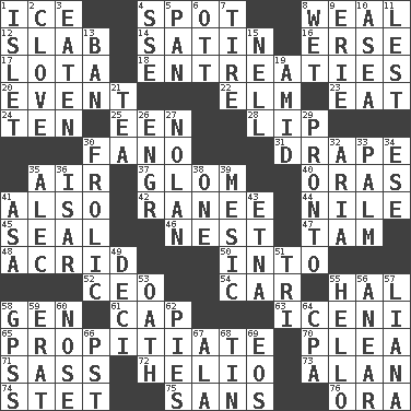 ACROSS 1. Frozen water 4. Blemish 8. Welt 12. Broad, flat, thick piece 14. Smooth fabric 16. Celtic language 17. Globular water bottle used in Asia 18. Pleas 20. Happening 22. Shade tree 23. Consume 24. "___ Little Indians" 25. Car or cant ending 28. Mouth edge 30. Papal veil 31. Window treatment 35. Atmosphere 37. Seize upon or latch onto something 40. Mouths or openings 41. In addition 42. Indian princess (variant) 44. The longest river in the world 45. Lick closed 46. A home for chicks 47. Scottish cap 48. Sour-tasting 50. To the inside or interior of 52. Corporate head (abbr.) 54. Automobile 55. Actor Linden 58. Commissioned military rank (abbr.) 61. Head covering 63. Ancient Celtic tribe of eastern Britain 65. Conciliate 70. Entreaty 71. Backtalk 72. Sun: prefix 73. Actor Alda or Thicke 74. Proofreading order 75. Without 76. Mouth or opening DOWN 1. Small island 2. Garlic unit 3. Consumed 4. Compass dir. 5. Baking dish 6. Baseball player Mel 7. Become fatigued 8. Soggy 9. One of the Great Lakes 10. At sea 11. For fear that 13. Forbid 15. 1994 drama film starring Jodie Foster 19. Among 21. Beverage made from leaves 26. Engineer (abbr.) 27. Pitcher Ryan 29. Right away 30. Romp 32. Operatic vocal solo 33. Inside of hand 34. Compass dir. 35. Actor Baldwin 36. Austrian river, tributary to the Danube 38. Single 39. Of or pertaining to a meson 41. White ___ sheet 43. Inactive volcano in Sicily 49. Tenth: prefix 51. Three (prefix) 53. Pledge 55. Phone greeting 56. Approach 57. Woody, climbing, usually tropical plant 58. Global Positioning Systems (abbr.) 59. Part of Q.E.F. 60. Characteristic smell of wine 62. Sliced desserts 64. Accounting whiz (abbr.) 66. Pacific Standard Time (abbr.) 67. According to 68. Metal container 69. Greek goddess of the dawn