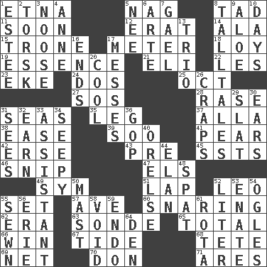 ACROSS 1. Inactive volcano in Sicily 5. Tired old horse 8. Bit 11. Within a short period 12. Part of Q.E.F. 14. Chicken ___ king 15. Heavy duty weighing machine 17. Distance measurement 18. Myrna of the movies 19. Gist 21. Biblical high priest 22. French article 23. Make supply last 24. Two (Sp.) 25. Sep. follower 27. Mayday 28. Raze (variant) 31. Oceans 35. Part of a journey 37. Silent film actress Nazimova 38. Relaxation 39. "Barney Miller" actor Jack 41. Lightbulb-shaped fruit 42. Celtic language 43. Before (prefix) 45. Fast planes 46. Clip 47. Raised railways 49. Symbol (abbr.) 51. Pet locale 52. Lion 55. Put into a specified state 57. "___ Maria" 60. Catching in a trap 62. Period 63. Something which is sent 65. Add up to 66. Victory 67. Event that recurs at intervals 68. Wig 69. Remaining after all deductions 70. Spanish title 71. Ancient Greek god of war DOWN 1. First name in cosmetics 2. Cod relative 3. Trap for birds or small mammals 4. Queen of England 1702-14 5. Born 6. Johnson of "Laugh-In" 7. Highlander 8. Baron Munchausen's specialties 9. Medicinal plant 10. 24-hour periods 13. Musical group of three 16. Conclusions 17. Makes clutter 20. Calm and collected 26. Dice game 29. Narrow board 30. Hearing organs 31. Observes 32. Merit 33. Aide 34. Not well drained, as in land 36. Grand Old Party 40. Threatening words 44. Style 48. Petty quarrel 50. Vertical spar for supporting sails 52. 61 cubic inches 53. Maternal 54. Stares 55. Stitched 56. One of the Great Lakes 58. Nothingness 59. Inside; within (prefix) 61. Round or rotation of duties 64. Lair