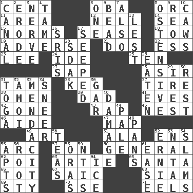 ACROSS 1. Penny 5. Chief or king in Benin or Nigeria 8. The grampus (Milton) 11. Length times width 12. 1994 drama film starring Jodie Foster 14. Ocean 15. Typical models 17. Gospel singer Marvin 18. Pull behind 19. Contrary to your interests or welfare 21. Two (Sp.) 22. Double-curved letter 23. Area sheltered from the wind 24. Binary compound 25. "___ Little Indians" 27. Plant excrement 28. SW Saudi Arabia district 31. Scottish caps 35. Barrel 37. Hoop that covers a wheel 38. Presage 39. Male parent 41. Nights before holidays 42. Went 43. Hit sharply and swiftly 45. A home for chicks 46. Helper 47. Atlas unit 49. Nonscientific branch of learning 51. Insect wing 52. Followers of ems 55. Curve 57. A really long time 60. Commissioned military rank 62. Luau course 63. Nick name for Arthur 65. Before Barbara or Clara 66. Small child 67. Ketch in the Levant 68. Thailand, formerly 69. Filthy place 70. Compass dir. 71. Snakelike fish DOWN 1. Lessep's creation 2. Wear away 3. Impudent aggressiveness 4. Not wild 5. Single 6. Necklace unit 7. In addition 8. Clearly or manifestly demonstrative 9. Vintage cars 10. Crow sounds 13. For fear that 16. Indian titles of respect 17. Oozed 20. Neighbor of Neb. 26. Eroded 29. Angers 30. Relief 31. Ancient Roman robe 32. Mine, in Marseilles 33. Ananias' fault 34. Contemptuous expression 36. Slender fish 40. Break 44. Diluted with white 48. Baking dishes 50. Beverages made from leaves 52. Bert's buddy 53. Relating to or accompanying birth 54. Hits or strikes with great force 55. Tenement units (abbr.) 56. Carrot, for example 58. Mouths or openings 59. Nuclear Threat Initiatives 61. Relaxation 64. Frozen water