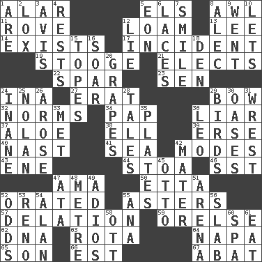 ACROSS 1. Having or resembling wings 5. Raised railways 8. Leather borer 11. Be footloose 12. Rich soil 13. Area sheltered from the wind 14. Is extant 17. Event 19. Moe Howard, for one 21. Chooses 22. Practice fight 23. Elected rep. 24. _ tizzy (2 wds.) 27. Part of Q.E.F. 29. Ribbon knot 32. Typical standards 34. Infant food 36. One who doesn't tell the truth 37. Medicinal plant 38. Pipe bend 39. Celtic language 40. Political cartoonist Thomas 41. Ocean 42. Methods 43. Compass dir. 44. Portico 46. Fast jet (abbr.) 47. Nanny (var.) 50. Singer James 52. Spoke pompously 55. Michaelmas daisies 57. Conveyance 59. Threatening words 62. Heredity factor (abbr.) 63. Roll call or roster of names 64. California wine valley 65. Boy, to dad 66. Eastern Standard Time (abbr.) 67. Blind as ____ DOWN 1. "We ___ not amused" (Victoria) 2. Brine-cured salmon 3. Advice 4. Musical pauses 5. Period of immesurable duration 6. Shoestrings 7. Grin 8. Actor Baldwin 9. Gone 10. Allows 12. Untruth 15. Drinks excessively 16. Fly high 18. Lair 20. Raisin fruits 24. Lacking in sense or substance 25. Pitcher Ryan 26. Came up 28. Lies 29. Avian creatures 30. Fertile tracts in a desert 31. Take or capture by force 33. Was introduced to 35. Food holders 36. Lion 42. Mother 45. "Beetle Bailey" pooch 47. "One Day ___ Time" 48. Distance measurement (Brit.) 49. Goodbye (Sp.) 51. Sports stadium 52. Likelihood 53. Western Nevada city 54. ____ Jay Lerner 55. Santa ___, CA 56. Broad, flat, thick piece 58. Baseball player Mel 60. Health resort 61. Erode