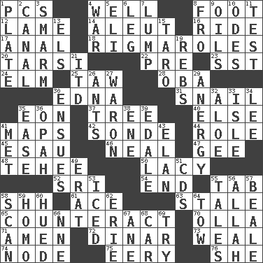 ACROSS 1. Personal Computers (abbr.) 4. Water source 8. Lowest support of a structure 12. Unable to walk 14. Native American of Southwest Alaska 16. Travel on or in a vehicle 17. Of or related to the anus 18. Complicated, petty procedures 20. Tarsus (plural) 22. Before (prefix) 23. Fast jet (abbr.) 24. Shade tree 25. The 23rd letter of the Hebrew alphabet 28. Chief or king in Benin or Nigeria 30. Pulitzer Prize-winning author Ferber 31. Slow-paced one 35. Age 37. Family _ (genealogy) 40. Otherwise 41. Atlas contents 42. Message 44. Hero or heavy, e.g. 45. He sold his birthright 46. Anneal 47. Unit of force equal to gravity 48. Giggle 50. Made of lace 52. _ Lanka 54. Conclude 55. Bar bill 58. Quiet! 61. Adept person 63. Showing deterioration from age 65. Act in opposition 70. Rounded earthenware pot or jar 71. So be it 72. Middle Eastern gold or silver currency 73. Welt 74. Connecting point 75. Suggestive of the supernatural 76. A female animal or person DOWN 1. Food holder 2. Lessep's creation 3. Excessive but superficial compliments 4. Armed conflict 5. Connecticut Ivy Leaguer 6. Part of a journey 7. Mass 8. Back 9. Lubricates 10. Lyric poems 11. Trial 13. Raised railways 15. Pacific island yam 19. Confederate soldiers (slang) 21. It would 26. Pismires 27. Make _____ (do battle with) 29. Disorder of the immune system 30. Takes place subsequently 32. _ vera 33. Small island 34. Area sheltered from the wind 35. Comfort 36. Brightly colored fish 38. Compass dir. 39. Peak District village in England 41. Was introduced to 43. Flair 49. Part of Q.E.F. 51. Music discs 53. On the rocks 55. Lies 56. Assad's deity 57. Calif. Air Force Base 58. Skim 59. Like (prefix) 60. Became colored 62. 4th largest of the Great Lakes 64. Pull behind 66. Compass dir. 67. One (Scot) 68. 4-wheeled motor vehicle 69. Attempt