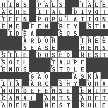 ACROSS 1. Chest bones 5. Friends 9. Story 13. Measure of real estate 14. Slanted text style (abbr.) 15. A piece of turf (Scot.) 16. Adolescent 17. Census information 19. Compass dir. 20. Opposite of masc. 21. Marina Del _, California 22. R.R. building 23. The main thing one is thinking about 25. Mayday 26. Zeal 30. Family _ (genealogy) 34. Gospel singer Marvin 35. Coop moms 36. Filth; sediment 39. Administered medicine 42. State of inaction 43. The visible part of the earth's surface 44. Grayish beige 46. Conclusions 47. Took without asking 48. E Mali city 51. "____ silly question..." 54. Call ___ day 57. Curve 58. Like a shrinking violet 60. Mouth or opening 62. Unrelated to defense, as in spending 65. Arab leader 66. Lessep's creation 67. Pismires 68. Collude with 69. An important port of Yemen 70. Egg locale 71. Court order DOWN 1. Pace 2. Ancient Celtic tribe of eastern Britain 3. A special lineage 4. Elected rep. 5. Corncob 6. Tiny particle 7. Infant locale 8. Plays smoothly or legato 9. Teat (slang) 10. Deliberation 11. Plunder 12. Inactive volcano in Sicily 15. 24-hour periods 18. Lion 20. Conductor's collection 24. Artist's stands 27. June honoree 28. Bear (Spanish) 29. Musical pauses 30. Threesomes 31. To separate or throw off 32. Followers of ems 33. Eastern Standard Time (abbr.) 36. Compass dir. 37. Electrically charged atom 38. Flaplike covering 40. Ingest 41. Superhero pair 45. Romp 48. Highlander 49. Sandy's bark 50. Sea 52. Dried seaweed eaten as food 53. Satellite of Uranus 54. South American Indian 55. Frog relative 56. Singer Murray 58. Fast planes 59. Behest 61. Johnson of "Laugh-In" 63. Daniel's nick name 64. Compass dir. 65. Ewer handle