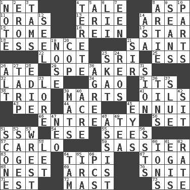 ACROSS 1. Fish or hair follower 4. Lie 8. Viper 11. Mouths or openings 13. One of the Great Lakes 14. Type of rug 15. Heavy book 16. It's straight from the horse's mouth 17. Play the lead 18. Center 21. Virtuous person 22. Spoils 23. Indian title of respect (Mr.) 25. Curvy letter 26. Had dinner 29. Orators 32. Dipping utensil 34. E Mali city 35. ___ a Wonderful Life 38. Musical group of three 39. Shops 41. Petroleums 43. For each 44. Adept person 45. World-weariness 46. Plea 50. Put into a specified state 51. Compass dir. 54. Compass dir. 55. Observes 57. Monte _, Las Vegas Hotel/Casino 59. More lively and spirited 63. Double curve, resembling the letter S 64. Native american tent (variation) 67. Ancient Roman robe 68. Egg locale 69. Curves 70. In a ____ (agitated or irritated) 71. Eastern Standard Time (abbr.) 72. Vertical spar for supporting sails 73. Compass dir. DOWN 1. Brief written record 2. Greek god of love 3. Scottish caps 4. Cylindrical with tapered ends 5. "We ___ not amused" (Victoria) 6. Cards in a Roman deck? 7. Car or cant ending 8. Nick name for Arthur 9. Seines 10. Pieces 12. Stitch closed the eyes of (a falcon) 14. White ___ sheet 19. Characteristic smell of wine 20. Police officer (slang) 21. Title for a knight 23. Three-handed card game 24. Vintage cars 26. The first octave above the treble staff 27. Canvas cover 28. Singer Brickell 30. Match 31. The Jewish people; Israel 33. Old wives' tales, e.g. 36. Airtight sealed metal containers 37. Change direction abruptly 39. Floor protectors 40. 43,560 square feet 42. Be seated 45. Snake ____ (dice throw) 47. Modern: prefix 48. Aid 49. Afternoon social gathering 51. Biscuitlike quick bread 52. Gurus 53. Obtain by seizing forcibly or violently 56. Fast planes 58. Allow 60. Charged atoms 61. Armor plate that protects the chest 62. Assign a rank or rating to 64. Scottish cap 65. Lyricist Gershwin 66. Personal Computers (abbr.)