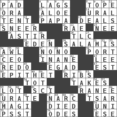 ACROSS 1. Writing tablet 4. Straggles 8. Drink excessively 12. Mouth or opening 13. _ vera 14. Mountain range 15. Portable shelter 17. Dad 18. Allots cards 19. Contemptuous expression 21. Actress Charlotte 23. Born 24. Being in motion 26. Affectionate concern, for short 28. Genesis locale 30. Deli grouping 34. Leather borer 37. Words to Nanette 39. Sweet dark-red dessert wine 40. Corporate head (abbr.) 41. Lacking in sense or substance 43. Area sheltered from the wind 44. Do over again 46. Mild oath 47. Eastern Standard Time (abbr.) 48. Curse 51. Chest bones 54. Small child 55. Proceeds 58. Car dealer's back yard 61. _-fi 63. The wife of a rajah (variant) 65. A salt of uric acid 67. Drug cop 71. Russian ruler of old 72. Wise men 73. Passed on 74. Corn or form start 75. Inconspicuous attention getter 76. Lyric poems 77. Compass dir. DOWN 1. Cooking vessels 2. Sports stadium 3. Natives or inhabitants of Denmark 4. Pet locale 5. In the manner of 6. Republican Party 7. Burn superficially 8. Third day of the wk. 9. Northwest Algerian city 10. Diluted with white 11. Otherwise 16. False hair 18. Small valley 20. To free from 22. "One Day ___ Time" 25. Painter Guido (1575-1642) 27. Head covering 29. Music written for nine 30. Underwater navigation system 31. Undercover agent 32. Angers 33. Proofreading order 34. 1/640 square mile 35. Shed a tear 36. Farming town in central California 38. Tired old horse 42. Prepare for publication 45. Baseball player Mel 49. Flexible conduit 50. And so on (abbr.) 52. Oblong piece of solid material 53. Three-handed card game 56. Follow as a consequence or result 57. Actors Connery and Penn 58. Mass 59. Mouths or openings 60. Labels 62. Southeast Asian peninsula 64. 4th largest of the Great Lakes 66. Teat (slang) 68. Help 69. To separate or throw off 70. Music discs