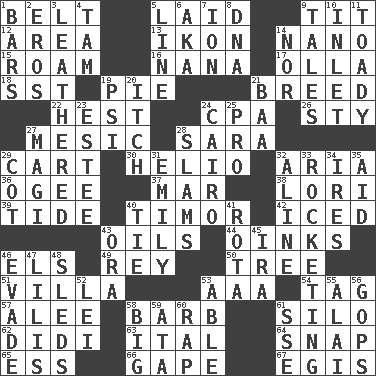 ACROSS 1. Waist strap 5. Put down 9. Teat (slang) 12. Type of rug 13. Image 14. Billionth: prefix 15. Wander 16. Nanny 17. Spanish pot 18. Fast jet (abbr.) 19. Sliced dessert 21. A special lineage 22. Behest 24. Tax preparer (abbr.) 26. Filthy place 27. Mesonic 28. "Two Mules for Sister ____" 29. Heavy open wagon 30. Sun: prefix 32. Operatic vocal solo 36. Double curve, resembling the letter S 37. Third mo. 38. Australian parrot (variant) 39. Periodic rise and fall of the sea level 40. Southeast Indonesia island 42. On the rocks 43. Lubricates 44. Pig sounds 46. Raised railways 49. Marina Del _, California 50. Relationship diagram 51. Country residence 53. American Automobile Association (abbr.) 54. Label 57. Toward shelter 58. Sharp remark 61. Grain storage tower 62. "You Light Up My Life" star Conn 63. Slanted text style (abbr.) 64. Fastener 65. Curvy letter 66. Open wide 67. The front part of a cuirass DOWN 1. Long, evenly shaped pieces 2. Greek god of love 3. Resembling or made to resemble leather 4. Scottish cap 5. Actor's bit 6. Alias (abbr.) 7. Electrically charged atom 8. Heredity factor (abbr.) 9. Stories 10. An arm off of a larger body of water 11. Sycophant 14. Not either 19. 23rd letter of the Greek alphabet 20. Hankering 21. Sound made by sheep 23. First name in cosmetics 24. Capital of Egypt 25. Adept person 27. Wise men 28. Hits or strikes with great force 29. Small bed 31. Poet Dickinson 32. Place in a line 33. Shooting up abruptly 34. Angers 35. Assist 40. Standoff 41. Round or rotation of duties 43. Mouth or opening 45. Retirement account (abbr.) 46. Dodge 47. Ms. Damita and namesakes 48. Bobsleighs 52. Luau accessory 53. Competent 55. Jai ____ 56. Republicans 58. Large 59. _ moment's notice (2 wds.) 60. Hit sharply and swiftly 61. Compass dir.