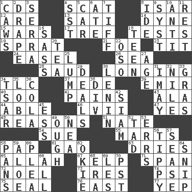 ACROSS 1. Music discs 4. Scram, to a cat 8. Austrian river, tributary to the Danube 12. "We ___ not amused" (Victoria) 13. Suttee (variant) 14. Centimeter-gram-second unit of force 15. Armed conflicts 17. Not kosher 18. Trials 19. Small fatty European fish 21. Enemy 23. Teat (slang) 24. Artist's stand 26. Ocean 28. Saudi Arabian king (1953-1964) 30. Yearning 34. Affectionate concern, for short 37. Ancient Persian 39. Arab leader 40. "Barney Miller" actor Jack 41. Aches 43. Wing 44. Competent 46. 57 in ancient Rome 47. Affirmative reply 48. Thinks logically 51. Nathan's nickname 54. Take to court 55. Shops 58. Infant food 61. E Mali city 63. Frees from moisture 65. Assad's deity 67. Seaweed 71. Connect, as a bridge 72. Christmas carol 73. Angers 74. 23rd letter of the Greek alphabet 75. Lick closed 76. Compass direction 77. Slangy assent DOWN 1. Crow sounds 2. Window treatment 3. Spanish missionary in California 4. Fast jet (abbr.) 5. 4-wheeled motor vehicle 6. Had dinner 7. Small quarrel 8. Binary compound 9. System (abbr.) 10. Opposed to 11. Respite 16. Backtalk 18. Adolescent 20. Beverage made from leaves 22. Bear (Spanish) 25. Mass 27. Ripen 29. Allots cards 30. Soviet premier 1918-24 31. "If ____ say so..." 32. The longest river in the world 33. Pate de foie ____ 34. Russian ruler of old 35. Ear part 36. Root beer relative 38. HTML Container Element 42. Thailand, formerly 45. Curvy letter 49. Ending for "Through" and "Enough" 50. Teachers' org. 52. Small amount or degree 53. Blunders 56. Likely to tip or tilt 57. Gospel singer Marvin 58. Baking dishes 59. _ vera 60. Entreaty 62. Migrant worker of the '30s 64. Clip 66. 100% 68. Epoch 69. French article 70. Pacific Standard Time (abbr.)
