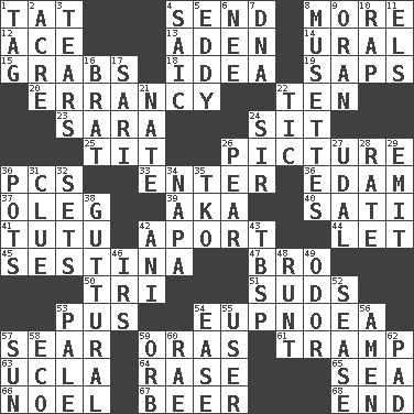ACROSS 1. Make lace 4. Post 8. Greater amount 12. Adept person 13. Arabian gulf 14. Mountain range 15. Seizes 18. It may be bright or harebrained 19. Plant excrements 20. The state or an instance of erring 22. "___ Little Indians" 23. "Two Mules for Sister ____" 24. Be seated 25. Teat (slang) 26. Photo 30. Personal Computers (abbr.) 33. Keyboard key 36. Dutch treat 37. Cassini of fashion 39. Alias (abbr.) 40. Suttee (variant) 41. Ballerina skirt 42. To the left, to Queeg 44. Allow 45. French poetic form 47. Sis' sibling 50. Three (prefix) 51. Soap bubbles 53. Suppuration 54. Normal relaxed breathing 57. Scorch 59. Mouths or openings 61. _____ steamer (cargo ship) 63. Southern CA. univ. 64. To erase 65. Ocean 66. Christmas carol 67. Fermented drink made from hops 68. Conclusion DOWN 1. Label 2. Land measure 3. Lacerates 4. Ketch in the Levant 5. Whirlpool 6. Born 7. Heredity factor (abbr.) 8. French bagpipes 9. Northwest Algerian city 10. Hit sharply and swiftly 11. Raised railways 16. Naughty child 17. Indian skirt 21. Nathan's nickname 22. Nervous spasm 24. Title for a knight 26. Lightbulb-shaped fruit 27. Hereditary estate 28. Pace 29. Give off 30. Plant holders 31. A slight indication 32. Puts into a specified state 34. California wine valley 35. Ring climax 38. From the throat 42. Cuckoo 43. Cook's measure (abbr.) 46. Big collection agency 48. Undersized animal 49. Scent 52. Gospel singer Marvin 53. Light colored 54. Relaxation 55. One who uses or employs something 56. So be it 57. Player for Phoenix 58. Environmental prefix 59. Globe 60. Actress Charlotte 62. Groovy apt.
