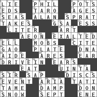 ACROSS 1. Untruth 4. Silvers or Donahue 8. Cooking vessels 12. Begley and Asner 13. Edible starchy tuberous root 14. Eons 15. Oceans 17. ____ Jay Lerner 18. Small fatty European fish 19. Proceeds 21. Girls' org. (abbr.) 23. Double-curved letter 24. 61 cubic inches 26. Tate display 28. Age 30. Glorified 34. Pipe bend 37. Disorderly crowds 39. Quote 40. E Mali city 41. Food holder 43. Heredity factor (abbr.) 44. Assistant 46. Ancient Greek god of war 47. Hearing organ 48. Popular '50s hangout 51. Hearing organs 54. Ingest 55. National forest in Provo, Utah 58. Title for a knight 61. Plant excrement 63. Flat circles 65. Happening 67. Operatic vocal solo 71. Jacques of French films 72. Not wild 73. Moist 74. Spanish title 75. Frozen precipitation 76. Back-to-school mo. 77. Compass dir. DOWN 1. For fear that 2. Standard of perfection 3. 1973 Nobel Price Winner (Physics) Leo 4. Parent Teacher Association (abbr.) 5. Actor Linden 6. Lyricist Gershwin 7. Having great length 8. Infant food 9. Legendary monster 10. Beverages made from leaves 11. Fast planes 16. Bristle 18. "Two Mules for Sister ____" 20. Perceive with the eye 22. Saxophone 25. Play 27. Affectionate concern, for short 29. Pitcher Ryan 30. First name in cosmetics 31. Periodic rise and fall of the sea level 32. Inactive volcano in Sicily 33. Letter starter 34. Mild oath 35. Den 36. Farming town in central California 38. Drinking establishment 42. He sold his birthright 45. First lady 49. 90 degrees 50. Call ___ day 52. To free from 53. In a ____ (agitated or irritated) 56. Sadhe (variant) 57. NE Massachussets city 58. Arranges properly for use 59. "Terrible" tsar 60. San ____ (Riviera town) 62. Writing tablets 64. Trig term 66. ___ Haven, CT 68. Actress Charlotte 69. Naughty child 70. Fitting
