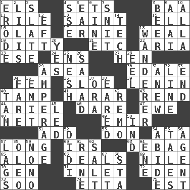 ACROSS 1. Raised railways 4. Puts into a specified state 8. Sound made by sheep 11. Cause heat under the collar 13. Virtuous person 15. Pipe bend 16. Norwegian king 17. Bert's buddy 18. Welt 19. Simple song 21. And so on (abbr.) 22. Operatic vocal solo 23. Compass dir. 24. Followers of ems 27. Layer 29. Toward the sea 30. Peak District village in England 34. Opposite of masc. 36. A type of plum 39. Soviet premier 1918-24 40. Pack (down) 41. Ethiopian city, capital of Harari 43. Tear apart 44. Satellite of Uranus 46. Have the gumption 47. She-sheep 48. Distance measurement (Brit.) 49. Arab leader 51. Find the sum of 53. Spanish title 54. _ moment's notice (2 wds.) 57. Yearn 60. Big collection agency 63. Debunk (Brit. slang) 65. Medicinal plant 66. Allots cards 69. The longest river in the world 70. Commissioned mil. rank 71. An arm off of a larger body of water 72. Paradise 73. "Barney Miller" actor Jack 74. Singer James 75. Eastern Standard Time (abbr.) DOWN 1. Eat (away) 2. Ms. Damita and namesakes 3. Schedule 4. Compass dir. 5. Ewer handle 6. Prong on a fork 7. In a ____ (agitated or irritated) 8. Fermented drink made from hops 9. Jai ____ 10. Silent film actress Nazimova 12. Newt 14. Technical work 18. Roamer 20. It is so 25. Tender 26. Vegetable dish 28. Snakelike fish 29. Electrical Measurement 31. Afresh 32. Actor's bit 33. Conclusion 34. Conductor's collection 35. Give off 37. Mouth or opening 38. Having ears or earlike features 40. Scottish cap 42. San ____ (Riviera town) 45. Directed 50. Working for oneself (abbr.) 52. "You Light Up My Life" star Conn 54. Remain 55. Lies 56. Representative 57. Falls behind 58. Margarine 59. Words to Nanette 61. French philosopher Descartes 62. Table seasoning 64. Compass dir. 67. Allow 68. R.R. building