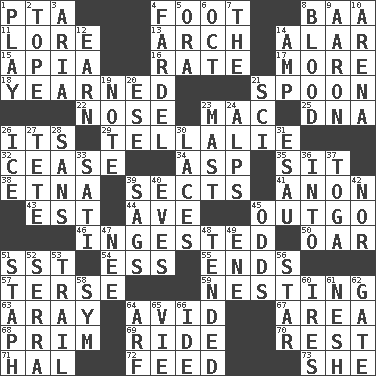 ACROSS 1. Parent Teacher Association (abbr.) 4. 12 inches 8. Sound made by sheep 11. Old wives' tales, e.g. 13. Bowlike part 14. Having or resembling wings 15. Capital of Western Samoa 16. Pace 17. Greater amount 18. Felt deep pity or tenderness 21. Soup utensil 22. Olfactory organ 23. Apple computer (short form) 25. Heredity factor (abbr.) 26. It is 29. Copy Pinocchio 32. Stop 34. Cleo's killer 35. Be seated 38. Inactive volcano in Sicily 39. Religious groups 41. At once, immediately (arch.) 43. Eastern Standard Time (abbr.) 44. "___ Maria" 45. Money paid out 46. Swallowed 50. Boat paddle 51. Fast jet (abbr.) 54. Double-curved letter 55. Extremities 57. Laconic 59. Nestling 63. Like ___ of sunshine 64. Enthusiastic 67. Length times width 68. Demure 69. Travel on an animal 70. Relief 71. Actor Linden 72. Nourish 73. A female animal or person DOWN 1. Shaw product 2. Drink excessively 3. Operatic vocal solo 4. Pack 5. Mouth or opening 6. Sep. follower 7. Definite Article 8. Vital fluid 9. Composer Copland 10. Sports stadium 12. Merit 14. Electrical Unit 19. Make mention of 20. Compass dir. 21. _-fi 23. Vertical spar for supporting sails 24. High mountains 26. Frozen water 27. False hair 28. Without 30. Shoestrings 31. He sold his birthright 33. Suttee (variant) 36. To the inside or interior of 37. Ancient Roman robe 39. Settles 40. Nights before holidays 42. And not 45. Probability 47. Born 48. Watched over 49. Compass dir. 51. Staphylococcus 52. Spanish missionary in California 53. Get behind 56. Play the lead 58. Symbol (abbr.) 60. Angers 61. Delicate 62. Yard entry 64. Sandy's bark 65. Compete 66. Binary compound
