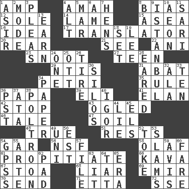 ACROSS 1. Electrical Unit 4. Nursemaid 8. Prejudice 12. Not divided or shared with others 14. Unable to walk 15. Toward the sea 16. The main thing one is thinking about 17. Interpreter 20. Buttocks 21. Perceive with the eye 22. Black tropical American cuckoo 23. Snout, nose 27. Adolescent 29. Nuclear Threat Initiatives 31. Blind as ____ 34. _ dish (used to culture cells) 35. Court order 36. Dad 39. Biblical high priest 41. Flair 42. Close up, plug up 43. Stared 46. Falsehood 47. Land 48. Loyal 51. Musical pauses 54. Slender fish 56. Overdraft (abbr.) 58. Norwegian king 61. Conciliate 66. Polynesian shrub of the pepper family 67. Portico 68. One who doesn't tell the truth 69. Arab leader 70. Post 71. Singer James 72. Compass dir. DOWN 1. SW Saudi Arabia district 2. Method 3. Entreaties 4. Keyboard modifier key 5. Make imperfect 6. Wet nurse (var.) 7. Coop moms 8. Sound made by sheep 9. Byzantium, centuries later 10. Period of immesurable duration 11. Indian skirt 13. Merit 18. Arrange properly for use 19. Area sheltered from the wind 24. Single 25. Baseball player Mel 26. Become fatigued 28. Having ears or earlike features 30. Grain storage towers 32. Chicken ___ king 33. Nine, plus one 34. Some stationery 36. Pacific Standard Time (abbr.) 37. _ moment's notice (2 wds.) 38. Coward 40. Composer Stravinsky 44. Whopper 45. Raised railways 49. Corn or form start 50. Eastern Standard Time (abbr.) 52. Casino tip 53. Shuts with force 54. Global Positioning Systems (abbr.) 55. Johnson of "Laugh-In" 57. Do some clerical work 59. Advice 60. Conductor's collection 62. Writing tablet 63. Small island 64. Make lace 65. Epoch