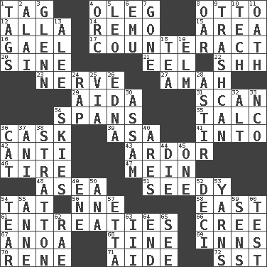 ACROSS 1. Label 4. Cassini of fashion 8. "Beetle Bailey" pooch 12. Silent film actress Nazimova 14. San ____ (Riviera town) 15. Length times width 16. Highlander 17. Neutralize 20. Trig term 21. Snakelike fish 22. Quiet! 23. Impudent aggressiveness 27. Nanny 29. Opera by Verdi 31. Examine minutely or intensely 34. Connects, as a bridge 35. Baby powder 36. Keg 39. White ___ sheet 41. To the inside or interior of 42. Against 43. Zeal 46. Hoop that covers a wheel 47. Chow _ 48. At sea 51. Sleazy 54. Make lace 56. Compass dir. 58. 90 degrees 61. Pleas 66. Algonquian 67. Small Philippine buffalo 68. Prong on a fork 69. Restaurants 70. French philosopher Descartes 71. Helper 72. Fast jet (abbr.) DOWN 1. Labels 2. Jai _ 3. American astronaut and politician John 4. The grampus (Milton) 5. Lion 6. Australian flightless bird 7. Went 8. Rowing implement 9. File 13 10. Technician 11. Pledge 13. Toward shelter 18. Afternoon social gathering 19. Shade tree 24. Hit sharply and swiftly 25. By way of 26. Pulitzer Prize-winning author Ferber 28. Moving or stirring 30. Indian state 32. The first octave above the treble staff 33. Non-commissioned officer (abbr.) 34. Atmospheres 36. Domesticated feline 37. Black tropical American cuckoo 38. Ski resort town in Vermont 40. Ancient Greek god of war 44. Pass on 45. Single 49. Compass dir. 50. Santa ___, CA 52. Tenth: prefix 53. Entertaining tales 54. Separate forcefully 55. Singer Murray 57. Singer James 59. Elected reps. 60. Trial 62. Actress Charlotte 63. One more than two 64. Conclusion 65. Observe