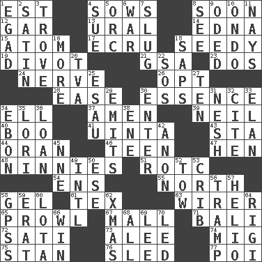 ACROSS 1. Eastern Standard Time (abbr.) 4. Sty mamas 8. Within a short period 12. Slender fish 13. Mountain range 14. Pulitzer Prize-winning author Ferber 15. Tiny particle 17. Shade of tan 18. Shabby and untidy 19. A piece of turf (Scot.) 21. Girls' org. (abbr.) 23. Two (Sp.) 24. Impudent aggressiveness 26. Choose 28. Relaxation 30. Core 34. Pipe bend 37. So be it 39. Famous astronaut Armstrong 40. Oct. 31 cry 41. National forest in Provo, Utah 43. R.R. building 44. NW Algerian seaport 46. Adolescent 47. Layer 48. Simpletons 51. College mil. group 54. Followers of ems 55. _ pole 58. Set 61. John Ritter's dad 63. One who wires 65. Move like a hungry wolf 67. Promenade 71. Indonesian resort city 72. Suttee (variant) 73. Toward shelter 74. Russian fighter aircraft 75. Comedian Laurel of Laurel & Hardy 76. Downhill vehicle 77. Luau course DOWN 1. Mild oath 2. Smooth fabric 3. Collection of objects 4. Institute legal proceedings 5. The grampus (Milton) 6. Armed conflict 7. A hard, heavy blow 8. Perceive with the eye 9. Wrote a lyric poem 10. Southwest Nigerian state 11. Negative votes 16. Greater amount 18. Plant excrements 20. Federal power corp. 22. Distress signal 25. Son of Isaac 27. "___ Little Indians" 29. Sends forth 30. Keyboard key 31. Soft 32. Quote 33. Enthusiasm 34. Inky black, to poets 35. Australian parrot (variant) 36. Grant temporary use of 38. Compass dir. 42. At once, immediately (arch.) 45. Compass dir. 49. International (abbr.) 50. Compass dir. 52. Pull behind 53. Baby bed with high sides 56. _____ steamer (cargo ship) 57. Sun: prefix 58. Global Positioning Systems (abbr.) 59. Part of Q.E.F. 60. Globular water bottle used in Asia 62. Dec. holiday 64. Swiss mountan, "Queen of the Mountains" 66. Victory 68. 100% 69. Area sheltered from the wind 70. Directed