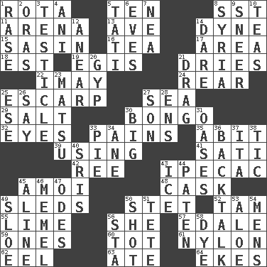 ACROSS 1. Round or rotation of duties 5. Nine, plus one 8. Fast jet (abbr.) 11. Sports stadium 13. "___ Maria" 14. Centimeter-gram-second unit of force 15. Indian antelope 16. Afternoon social gathering 17. Type of rug 18. Eastern Standard Time (abbr.) 19. The front part of a cuirass 21. Frees from moisture 22. "If ____ say so..." 24. Stern 25. Fortification 27. Ocean 29. Table seasoning 30. Beat drum 32. Sight organs 33. Aches 35. "This won't hurt ____!" 39. Putting into practice 41. Suttee (variant) 42. To separate or throw off 43. Medicinal drug used to evoke vomiting 45. Mine, in Marseilles 48. Keg 49. Bobsleighs 50. Proofreading order 52. Scottish cap 55. Citrus frut 56. A female animal or person 57. Peak District village in England 59. Singles 60. Small child 61. Thermoplastic polyamide 62. Snakelike fish 63. Had dinner 64. Supplements with great effort DOWN 1. To erase 2. Mouths or openings 3. One of the two male reproductive glands 4. Cuckoo 5. Jacques of French films 6. Nights before holidays 7. Teachers' org. 8. Damascus' land 9. Scornful expression 10. Afternoon social gatherings 12. Approach 14. Have the gumption 20. Con 21. To trail on the ground 23. Taiwanese island in East China Sea 25. Compass dir. 26. Declare 27. Male offspring 28. Followers of ems 30. Of large size 31. Fertile tracts in a desert 33. Sliced dessert 34. One (Scot) 36. Sass 37. Call ___ day 38. Nervous spasm 40. Indian titles of respect 43. Frozen water 44. Eucharist need 45. Place in a line 46. Klaipeda city 47. Lyric poems 49. _ gin 50. Opportunity 51. Wig 53. Medicinal plant 54. Not women's 56. R.R. building 58. Color