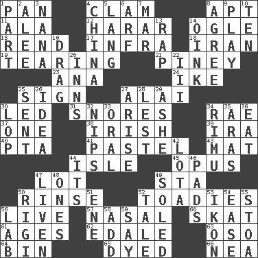 ACROSS 1. Baking dish 4. Burrowing marine mollusk 8. Fitting 11. According to 12. Ethiopian city, capital of Harari 14. Stare at amorously 15. Tear apart 17. Kind of red light 18. SW Asia republic 19. Rending 21. Abounding in pines 23. Santa ___, CA 24. Mamie's mate 25. Public display of a written message 27. Jai ____ 30. Directed 31. Sounds asleep 34. Actress Charlotte 37. Single 38. From or relating to Ireland 39. Lyricist Gershwin 40. Parent Teacher Assoc. 41. Soft color 43. Floor protector 44. Capri or Wight 45. Musical composition 47. Car dealer's back yard 49. R.R. building 50. Remove soap 52. Sycophants 56. Moving, as bait 57. Relating to the nose 60. Three-handed card game 61. Eons 62. Peak District village in England 63. Bear (Spanish) 64. Storage container 65. Colored 66. Teachers' org. DOWN 1. Component 2. Toward shelter 3. Nanny 4. Large country 5. Long (Scottish) 6. Sandy's bark 7. Spoil 8. Match 9. Live dramatic performance 10. "___ Little Indians" 13. Reproach for some lapse or misdeed 14. Pig sound 16. To draw with force 20. Lodging establishments 22. One more than two 25. Transmitted 26. The main thing one is thinking about 27. Ascend 28. For fear that 29. American tennis player Robert 30. Chop off 32. Pinches, bites 33. Relating to the mouth 34. Tall New Zealand timber tree 35. Caspian sea tributary 36. Consume 42. Globular water bottle used in Asia 44. ___ a Wonderful Life 46. Groovy apts. 47. Make or become more lively 48. Singles 49. Having a sole or soles 50. Swiss mountan, "Queen of the Mountains" 51. Compass dir. 52. Story 53. Picture 54. Relaxation 55. Portico 56. Experiment locale 58. Say or write further 59. Declare