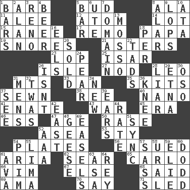 ACROSS 1. Sharp remark 5. Partially opened flower 8. Chicken ___ king 11. Toward shelter 12. Tiny particle 14. Car dealer's back yard 15. The wife of a rajah (variant) 17. San ____ (Riviera town) 18. Dad 19. Sounds asleep 21. Michaelmas daisies 23. Chop off 25. Austrian river, tributary to the Danube 26. Capri or Wight 27. Allow head to fall sleepily 28. Lion 31. Mountains (abbr.) 33. Daniel's nick name 35. Burlesque acts 37. Stitched 38. Portuguese money of account (variant) 40. Billionth: prefix 41. Maternal 43. Armed conflict 45. Epoch 46. Double-curved letter 47. Ripen 50. To erase 52. At sea 53. Filthy place 54. Food holders 56. Took place subsequently 61. Roberta Peters solo 62. Singe 65. Monte _, Las Vegas Hotel/Casino 66. Zeal 67. Otherwise 68. Stated 69. Nanny (var.) 70. Declare 71. Downhill vehicle DOWN 1. Drinking establishments 2. Actor Alda or Thicke 3. Western Nevada city 4. Fermented drink made from hops 5. Soap unit 6. Shoshoni 7. Realm 8. Having or resembling wings 9. Chops off 10. "One Day ___ Time" 13. With motion or animation 16. Snakelike fish 18. For each 20. Disposed of to a purchaser 22. Small amounts or degrees 24. Lightbulb-shaped fruit 26. Is not 28. One who doesn't tell the truth 29. Inactive volcano in Sicily 30. Bear (Spanish) 31. Not women's 32. It was, poetically 34. ___ Haven, CT 36. Leg joint 37. Perceive with the eye 39. Hearing organs 42. 90 degrees 44. Pace 48. Honkers 49. Artist's stands 51. Synchronize (abbr.) 52. Auto club (abbr.) 54. Demure 55. Pale green bean 57. Backtalk 58. Mountain range 59. Writer Wiesel 60. Texas town _ City 61. Actress Gardner 63. White ___ sheet 64. Marina Del _, California