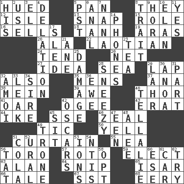 ACROSS 1. Became colored 5. Baking dish 8. Those people 12. Capri or Wight 13. Fastener 15. Hero or heavy, e.g. 16. Makes a sale 18. Hyperbolic tangent 19. Caspian sea tributary 20. Wing 22. Of or relating to Laos or its people 24. Look after 26. Fish or hair follower 27. It may be bright or harebrained 28. Ocean 29. Infant locale 32. In addition 35. Not women's 37. Santa ___, CA 38. Count _ (2 wds.) 39. Deep reverence 40. Son of Odin 41. Rowing implement 42. Double curve, resembling the letter S 43. Part of Q.E.F. 44. Eisenhower's nickname 45. Compass dir. 46. Ardor 49. Nervous spasm 50. Shout 51. Window treatment 55. Teachers' org. 56. "Corrida" creature 57. Printing process, for short 59. Choose 63. Actor Alda or Thicke 64. Clip 65. Austrian river, tributary to the Danube 66. Lie 67. Fast jet (abbr.) 68. Suggestive of the supernatural DOWN 1. Part of HMS, perhaps 2. Purpose 3. Pipe bend 4. Conveyance 5. Pacific Standard Time (abbr.) 6. Of or related to the anus 7. Grandmother 8. Distinguishing feature 9. Israeli folk dance 10. Flair 11. It is so 14. Gives a jingle 17. Downhill vehicle 21. A saturated hydrocarbon 23. Beverage made from leaves 25. Break 28. Dwarf with a sinus problem 29. Cowardly lion portrayer 30. Small Philippine buffalo 31. Role in a play 32. Mine, in Marseilles 33. Path through which fluid escapes 34. Father 36. She-sheep 40. Copy Pinocchio 42. Motion picture awards 45. Be seated 47. Car or cant ending 48. Toward shelter 49. Marketplace scale 51. Root beer relative 52. Mountain range 53. Charged particles 54. Nuclear Threat Initiatives 56. Make lace 58. Elect 60. Compass dir. 61. 4-wheeled motor vehicle 62. Attempt