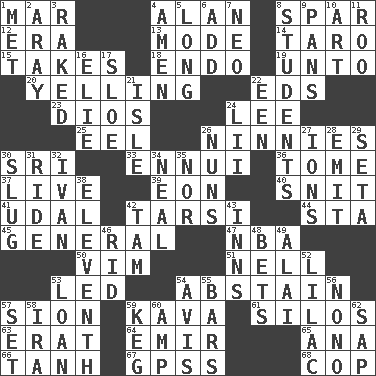 ACROSS 1. Make imperfect 4. Actor Alda or Thicke 8. Coast Guard woman 12. Period 13. Method 14. Pacific island yam 15. Proceeds 18. Inside; within (prefix) 19. To (old English) 20. Crying or shouting loudly 22. Begley and Asner 23. "Vaya con ____" 24. Area sheltered from the wind 25. Snakelike fish 26. Simpletons 30. _ Lanka 33. World-weariness 36. Heavy book 37. Moving, as bait 39. A really long time 40. In a ____ (agitated or irritated) 41. Freehold land 42. Tarsus (plural) 44. R.R. building 45. Commissioned military rank 47. Basketball assoc. 50. Zeal 51. 1994 drama film starring Jodie Foster 53. Directed 54. Refrain by choice 57. The Jewish people; Israel 59. Polynesian shrub of the pepper family 61. Grain storage towers 63. Part of Q.E.F. 64. Independent ruler or chieftain 65. Santa ___, CA 66. Hyperbolic tangent 67. Global Positioning Systems (abbr.) 68. Police officer (slang) DOWN 1. Was introduced to 2. Like ___ of sunshine 3. Swept the length of 4. So be it 5. Protracted 6. Say or write further 7. Modern: prefix 8. SAT takers 9. Zero-star reviews 10. Nonscientific branch of learning 11. Friend of Pooh 16. Writer Wiesel 17. _ gin 21. Capri or Wight 22. Car or cant ending 24. Cards in a Roman deck? 26. Religious women 27. Charged atoms 28. Send forth 29. Stalk of a moss capsule 30. Strike heavily 31. Travel on an animal 32. _ the terrible 34. Anneal 35. Or not 38. Veterans Day date 42. Scottish cap 43. Lodging establishments 46. To free from 48. Wagers 49. Mountain range southwest of Kyrgyzstan 52. Pale purple color 53. Grant temporary use of 54. Advice 55. Oblong pieces of solid material 56. Words to Nanette 57. Arrange properly for use 58. Lyricist Gershwin 59. Cask 60. Electrical Unit 62. Plant excrement