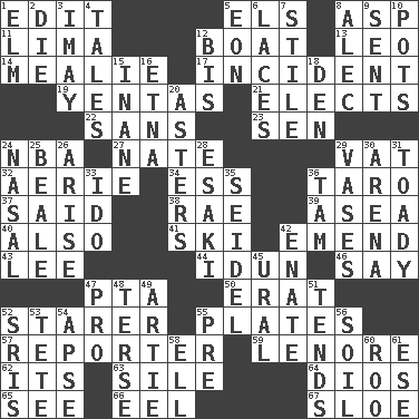 ACROSS 1. Prepare for publication 5. Raised railways 8. Cleo's killer 11. Pale green bean 12. Water vessel 13. Lion 14. Ear of corn 17. Event 19. Gossips 21. Chooses 22. Without 23. Elected rep. 24. Basketball assoc. 27. Nathan's nickname 29. Large container 32. Nest on high 34. Curvy letter 36. Pacific island yam 37. Stated 38. Actress Charlotte 39. At sea 40. In addition 41. What Jean-Claude Killy likes to do 42. Make improvements or corrections to 43. Area sheltered from the wind 44. Goddess of spring and wife of Bragi 46. Declare 47. Parent Teacher Assoc. 50. Part of Q.E.F. 52. A viewer who gazes fixedly 55. Food holders 57. News announcer 59. Poe poem 62. It is 63. Drop; flow; fall 64. "Vaya con ____" 65. Perceive with the eye 66. Snakelike fish 67. _ gin DOWN 1. Shade tree 2. Pass on 3. "If ____ say so..." 4. Stories 5. Period of immesurable duration 6. Shoestrings 7. Vertical member of a panel or frame 8. Actor Baldwin 9. Posted 10. Cooking vessels 12. Altar cloth linen 15. Empty; void 16. Inactive volcano in Sicily 18. Lair 20. Michaelmas daisies 24. Relating to the nose 25. Calif. Air Force Base 26. Ascend 28. 1973 Nobel Price Winner (Physics) Leo 29. Flower holders 30. Sports stadium 31. Sycophant 33. Wedding promise 35. Beer mug 36. Scottish cap 42. Related on the mother's side 45. Mountain range 47. Adept person 48. Laconic 49. Nick name for Arthur 51. Looks after 52. Indian titles of respect 53. False hair 54. Domed church section 55. Before (prefix) 56. Land 58. Pipe bend 60. Friend of Pooh 61. Compass dir.
