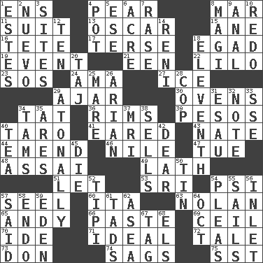ACROSS 1. Followers of ems 4. Lightbulb-shaped fruit 8. Third mo. 11. Costume for a special activity 13. Motion picture award 15. One (Scot) 16. False hair 17. Laconic 18. Mild oath 19. Incident 21. Car or cant ending 22. _ and Stitch 23. Mayday 24. Nanny (var.) 27. Frozen water 29. Partly open 30. Baking chambers 34. Make lace 36. Basketball hoops 39. Mexican monetary units 40. Edible starchy tuberous root 41. Having ears or earlike features 43. Nathan's nickname 44. Make improvements or corrections to 46. "Death on the ____" 47. Third day of the wk. 48. Slender Brazilian palm 49. Thin strip of wood or metal 51. Allow 53. _ Lanka 54. 23rd letter of the Greek alphabet 57. Stitch closed the eyes of (a falcon) 60. Call ___ day 63. Pitcher Ryan 65. "60 Minutes" Commentator Rooney 66. Thick mixture 69. To provide with a ceiling 70. Binary compound 71. Perfect 72. Lie 73. Spanish title 74. Sinks 75. Fast jet (abbr.) DOWN 1. _____ Park, CO 2. New (sp.) 3. Locates 4. Plant holder 5. Compass dir. 6. Measure of real estate 7. Raze (variant) 8. Wise men 9. Of or related to the anus 10. Do over again 12. Nine, plus one 14. Painter Guido (1575-1642) 18. Veterans Day date 20. _ Mahal 25. Female horse 26. Believer in; advocate of (suffix) 28. Police officer (slang) 29. Lacking a tonal center or key 31. He sold his birthright 32. Make mention of 33. Compass dir. 34. Scottish caps 35. Ancient Greek god of war 37. Medical imaging device (abbr.) 38. Makes a sale 40. Beverage made from leaves 42. Letter starter 45. Pass on 50. Metal container 52. Native american tent (variation) 54. Entreaties 55. Moves on water 56. An arm off of a larger body of water 57. Stated 58. Inside; within (prefix) 59. Locale of original sin 61. Small boys 62. At sea 64. Sep. follower 67. Label 68. Raised railways