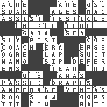 ACROSS 1. Measure of real estate 5. "We ___ not amused" (Victoria) 8. Bear (Spanish) 11. Neighbor of Neb. 12. Ripens 13. Tired old horse 14. Help 17. One of the two male reproductive glands 19. Main course 21. Cigar-shaped 22. Greek goddess of the earth (variant) 23. Ocean 24. Wily 27. Mail 29. Police officer (slang) 32. Team commander 34. Epoch 36. Celtic language 37. Legendary monster 38. Pet locale 39. Costume for a special activity 40. Billionth: prefix 41. Small drink 42. Postpone 43. Followers of ems 44. Lacerate 46. Three (prefix) 47. Shoshoni 50. Caspian sea tributary 52. Went by 55. Window treatments 57. Electrical Measurement 59. Gossips 62. Friend of Pooh 63. Cole _ (cabbage dish) 64. I made a mistake 65. Teat (slang) 66. Car or cant ending 67. Pace DOWN 1. White ___ sheet 2. Music discs 3. To erase 4. Supplementing with great effort 5. Ripen 6. Musical pauses 7. First name in cosmetics 8. At one time in the past 9. Table seasoning 10. Double curve, resembling the letter S 12. Had dinner 15. Staphylococcus 16. Musical group of three 18. Retirement account (abbr.) 20. Artist's stands 24. Biscuitlike quick bread 25. Utah city north of Ogden 26. Tall tales 28. Distinguishing feature 29. An unpleasant substance 30. Flexible twig of a willow tree 31. _ dish (used to culture cells) 33. Corporate head (abbr.) 35. Become visible 36. Compass dir. 42. Window treatment 45. Like ___ of sunshine 47. Purpose 48. Laconic 49. Peak District village in England 51. Sir (Sp.) 52. Component 53. Mine, in Marseilles 54. Specific locale 55. Morning condensation 56. Portico 58. Separate the seeds from cotton 60. Fitting 61. Compass dir.