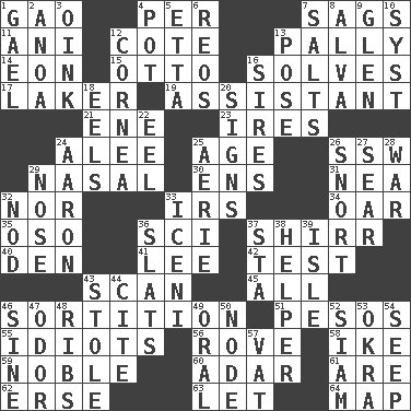 ACROSS 1. E Mali city 4. For each 7. Sinks 11. Black tropical American cuckoo 12. ____ d'Azur (French Riviera) 13. Chummy 14. Period of immesurable duration 15. "Beetle Bailey" pooch 16. Finds the solution 17. Member of a famous L.A. basketball team 19. Helper 21. Compass dir. 23. Angers 24. Toward shelter 25. Personal question 26. Compass dir. 29. Rhinal 30. Followers of ems 31. Teachers' org. 32. Or not 33. Big collection agency 34. Boat paddle 35. Bear (Spanish) 36. _-fi 37. Bake eggs in their shells 40. Lair 41. Area sheltered from the wind 42. Trial 43. Examine minutely or intensely 45. 100% 46. Decision 51. Mexican monetary units 55. Foolish or stupid persons 56. Be footloose 58. D.D.E's nickname 59. Impressive in appearance 60. The sixth month of the Jewish calendar 61. "We ___ not amused" (Victoria) 62. Celtic language 63. Allow 64. Atlas unit DOWN 1. Highlander 2. Small Philippine buffalo 3. Pig sound 4. Cooking vessel 5. Singer James 6. Vintage cars 7. Table seasonings 8. Inventor's middle name 9. Small, secluded valley 10. System (abbr.) 12. Pupil covering 13. Airs 16. Titles for men of rank and authority 18. Snakelike fish 20. Public displays of written messages 22. Snakelike fish 24. Composer Copland 25. Nest on high 26. Derisive sound 27. Singe 28. Armed conflict 29. Characteristic smell of wine 32. Allow head to fall sleepily 33. Ancient Celtic tribe of eastern Britain 36. Narrow boards 37. R.R. building 38. Assistant 39. Capri or Wight 43. Fur scarf 44. Quote 46. Trig term 47. Aroma 48. Teases 49. Of the mouth 50. Thickened enlargement 52. Thailand, formerly 53. Gumbo ingredient 54. Ooze 57. Large container