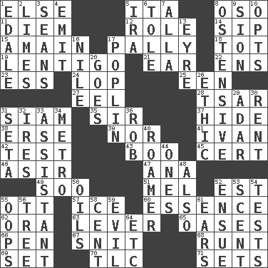 ACROSS 1. Otherwise 5. Call ___ day 8. Bear (Spanish) 11. South Vietnam president (1954) 12. Hero or heavy, e.g. 14. Small drink 15. With great haste 17. Friendly 18. Small child 19. Small, flat, pigmented spot on the skin 21. Hearing organ 22. Followers of ems 23. Double-curved letter 24. Trim (branches) 25. Car or cant ending 27. Snakelike fish 28. Russian ruler of old 31. Thailand, formerly 35. Title for a knight 37. Flintstone garb 38. Celtic language 39. Not either 41. _ the terrible 42. Trial 43. Surprise greeting 45. Foregone conclusion 46. SW Saudi Arabia district 47. Santa ___, CA 49. "Barney Miller" actor Jack 51. Cartoonist voice _ Blanc 52. Eastern Standard Time (abbr.) 55. Baseball player Mel 57. Frozen water 60. Gist 62. Mouth or opening 63. Crowbar 65. Fertile tracts in a desert 66. Writing instrument 67. In a ____ (agitated or irritated) 68. The smallest animal of a litter 69. Put into a specified state 70. Affectionate concern, for short 71. Arranges properly for use DOWN 1. Peak District village in England 2. Citrus fruits 3. Seines 4. Give off 5. Retirement account (abbr.) 6. Lacquered or enameled metalware 7. Silent film actress Nazimova 8. Clearly or manifestly demonstrative 9. The Jewish people; Israel 10. Chooses 13. Jane of fiction 16. Mediterranean tributary 17. Cotton for raincoats, e.g. 20. Leaves 26. Moral principle 29. The sixth month of the Jewish calendar 30. Monthly bill 31. Bristle 32. Angers 33. Helper 34. Paris' subway 36. Director Reiner 40. Wanderer 44. Washington bills 48. In addition 50. Petroleums 52. Take place subsequently 53. Odor 54. Trials 55. I made a mistake 56. Relationship diagram 58. Penny 59. Tending to cause great harm 61. Hearing organs 64. And so on (abbr.)