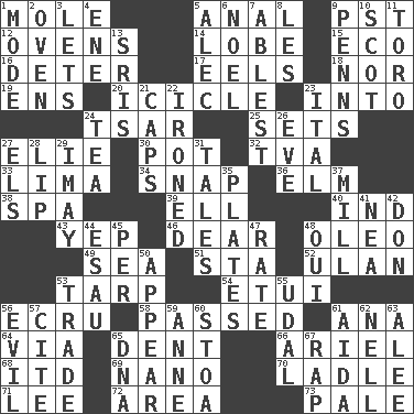 ACROSS 1. Undercover agent 5. Of or related to the anus 9. Pacific Standard Time (abbr.) 12. Baking chambers 14. Ear part 15. Environmental prefix 16. Prevent from occurring 17. Snakelike fish 18. Or not 19. Followers of ems 20. Tapering mass of hanging ice 23. To the inside or interior of 24. Russian ruler of old 25. Arranges properly for use 27. Writer Wiesel 30. Plant holder 32. Federal power corp. 33. Pale green bean 34. Fastener 36. Shade tree 38. Health resort 39. Pipe bend 40. Working for oneself (abbr.) 43. Slangy assent 46. Letter starter 48. Margarine 49. Ocean 51. R.R. building 52. ____ Bator 53. Canvas cover 54. Needle case 56. Shade of tan 58. Went by 61. Santa ___, CA 64. By way of 65. Gouge 66. Satellite of Uranus 68. It would 69. Billionth: prefix 70. Dipping utensil 71. Area sheltered from the wind 72. Length times width 73. Diluted with white DOWN 1. Method 2. Baking chamber 3. Allows 4. Compass dir. 5. Actor Baldwin 6. Christmas carol 7. Most capable 8. French article 9. Actor Sean's family 10. Native of Scotland 11. "Corrida" creature 13. Indian titles of respect 21. Balmoral and tarboosh 22. Pressed 23. Slanted text style (abbr.) 24. Afternoon social gathering 26. Night before a holiday 27. Raised railways 28. Mouth edge 29. "If ____ say so..." 31. Falsehoods 35. Food holders 37. Place where flour is made 41. Teachers' org. 42. Spanish title 44. Son of Isaac 45. For each 47. Assign a rank or rating to 48. Fr. "Yes" 50. Seem 53. Buy and sell 55. Freehold land 56. Tending to cause great harm 57. Quote 59. Singer Murray 60. Portico 61. Opera by Verdi 62. 1994 drama film starring Jodie Foster 63. Toward shelter 65. Heredity factor (abbr.) 67. Strike