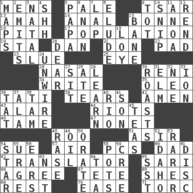 ACROSS 1. Not women's 5. Diluted with white 9. Russian ruler of old 13. Wet nurse 14. Of or related to the anus 15. Maid-servant 16. Essential or central part 17. Census information 19. R.R. building 20. Daniel's nick name 21. Spanish title 22. Writing tablet 23. Change direction abruptly 25. Sight organ 26. Relating to the nose 30. Painter Guido (1575-1642) 34. Compose 35. Butter sub 36. Jacques of French films 39. Pulls into pieces 42. So be it 43. Having or resembling wings 44. Debaucheries 46. Not wild 47. Music written for nine 48. Friend of Pooh 51. SW Saudi Arabia district 54. Institute legal proceedings 57. Atmosphere 58. Personal Computers (abbr.) 60. June honoree 62. Interpreter 65. Indian skirt 66. Match 67. Wig 68. "______ My Girl" (Turtles hit) 69. State of inaction 70. Comfort 71. Torque (variant) DOWN 1. Atlas contents 2. Gives off 3. Brizilian seaport 4. Quiet! 5. Dad 6. At once, immediately (arch.) 7. Pet locale 8. Evade 9. Small child 10. Sever or remove by pinching or nipping 11. Small Philippine buffalo 12. Tear apart 15. Object of repulsion 18. Myrna of the movies 20. Letter starter 24. Undo the wiring of 27. Be seated 28. Had dinner 29. Memorize 30. Cooks with dry heat, as in an oven 31. Shade tree 32. Born 33. Electrically charged atom 36. Make lace 37. Chicken ___ king 38. Scottish cap 40. _ de Janeiro 41. Male offspring 45. Beverages made from leaves 48. Raze (variant) 49. Lubricate 50. Speak pompously 52. Potato state 53. Less widely known 54. Play the lead 55. Goad 56. Hearing organs 58. Plant holders 59. Algonquian 61. Compact _ 63. Remaining after all deductions 64. Afternoon social gathering 65. Fast jet (abbr.)