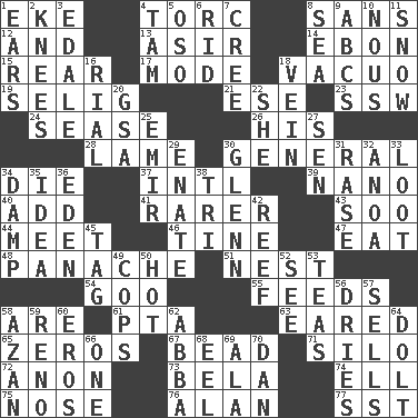 ACROSS 1. Supplement with great effort 4. Torque (variant) 8. Without 12. Plus 13. SW Saudi Arabia district 14. Inky black, to poets 15. Bring up, as a child 17. Method 18. In a vacuum (with "in") 19. Major League Baseball Commissioner Bud 21. Compass dir. 23. Compass dir. 24. Gospel singer Marvin 26. Part of HMS, perhaps 28. Unable to walk 30. Commissioned military rank 34. Pass on 37. International (abbr.) 39. Billionth: prefix 40. Find the sum of 41. More uncommon 43. "Barney Miller" actor Jack 44. Confront 46. Prong on a fork 47. Consume 48. Flamboyance 51. A home for chicks 54. Thick or sticky substance 55. Gives food to 58. "We ___ not amused" (Victoria) 61. Parent Teacher Association (abbr.) 63. Having ears or earlike features 65. Nothings 67. Necklace unit 71. Grain storage tower 72. At once, immediately (arch.) 73. Actor Lugosi 74. Pipe bend 75. Olfactory organ 76. Actor Alda or Thicke 77. Fast jet (abbr.) DOWN 1. Hearing organs 2. Leg joints 3. Peak District village in England 4. Scottish cap 5. Bear (Spanish) 6. To free from 7. Algonquian 8. Ocean 9. Lettered men learn these first 10. Good sense 11. Frozen precipitation 16. Monetary unit of Yemen 18. Distinctive style or manner 20. Girls' org. (abbr.) 22. A female animal or person 25. Independent ruler or chieftain 27. Elected rep. 29. Related on the mother's side 30. American astronaut and politician John 31. Raze (variant) 32. Small Philippine buffalo 33. Spoils 34. Moist 35. The content of cognition 36. Paradise 38. Three (prefix) 42. Coral collection 45. Label 49. 911 reaches them 50. Being at a high temperature 52. Perceive with the eye 53. Beverages made from leaves 56. Frees from moisture 57. Makes a sale 58. Muslim summons to prayer 59. Western Nevada city 60. Greek god of love 62. Swedish rock group 64. Dunce 66. Single 68. Snakelike fish 69. Wing 70. Daniel's nick name
