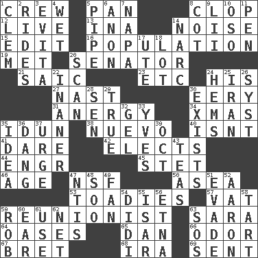 ACROSS 1. Ship's personnel 5. Baking dish 8. Hoof sound 12. Not recorded 13. _ tizzy (2 wds.) 14. Annoying sound 15. Prepare for publication 16. Census information 19. Was introduced to 20. Legislator 21. Ketch in the Levant 23. And so on (abbr.) 24. Part of HMS, perhaps 27. Political cartoonist Thomas 30. Suggestive of the supernatural 31. Disorder of the immune system 34. Dec. holiday 35. Goddess of spring and wife of Bragi 38. New (sp.) 40. Is not 41. Have the gumption 42. Chooses 44. Engineer (abbr.) 45. Proofreading order 46. Ripen 47. Overdraft (abbr.) 50. Toward the sea 53. Sycophants 57. Large container 59. One who advocates reunion 63. "Two Mules for Sister ____" 64. Fertile tracts in a desert 65. One of the 12 tribes of Israel 66. Aroma 67. Cy Young winner Saberhagen 68. Retirement account (abbr.) 69. Emitted DOWN 1. Clement's nick name 2. Amusement-park features 3. Webber/Rice musical 4. Dripping 5. Corncob 6. At once, immediately (arch.) 7. California wine valley 8. Small bed 9. Cards in a Roman deck? 10. Bear (Spanish) 11. Writing instrument 14. Drug cop 17. Shoshoni 18. Car dealer's back yard 20. Skim 22. More lacking in sense or substance 24. Cloth borders 25. SW Asia republic 26. System (abbr.) 28. Elected rep. 29. Loyal 30. Is extant 32. Set 33. Jacques Cousteau's middle name 35. The main thing one is thinking about 36. Mild oath, euphamism for damn 37. Goad 39. Sep. follower 43. Beverages made from leaves 47. Nuclear Threat Initiatives 48. "Barney Miller" actor Jack 49. Avid follower 51. Dodge 52. Composer Copland 54. "You Light Up My Life" star Conn 55. Austrian river, tributary to the Danube 56. Inactive volcano in Sicily 58. Small pie 59. Director Reiner 60. Ewer handle 61. Purpose 62. Fish or hair follower 63. Distress signal