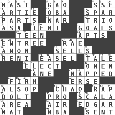 ACROSS 1. Political cartoonist Thomas 5. E Mali city 8. Compass dir. 11. Nick name for Arthur 13. Chief or king in Benin or Nigeria 14. Coast Guard woman 15. Actors' quests 16. Armed conflict 17. Musical group of three 18. White ___ sheet 19. Portable shelter 21. Scores awarded for successful feats 22. Adolescent 24. Flats, for short 25. Main course 27. Actress Charlotte 29. At once, immediately (arch.) 30. Exchanges for money 32. Painter Guido (1575-1642) 33. Artist's stand 35. Falsehood 39. Opt 41. Sign of things to come 42. One (Scot) 43. Slept 45. Not soft or yielding to pressure 48. Celtic language 49. Columnist Joseph or Stewart 50. US Secretary of Labor Elaine L. _ 52. Reproach for some lapse or misdeed 55. Dunce 56. Adept person 57. Any of the three canals of the cochlea 59. Length times width 60. Atmosphere 61. _ Allan Poe 62. Floor covering 63. Basketball assoc. 64. Posted DOWN 1. California wine valley 2. Caspian sea tributary 3. Ski resort town in Vermont 4. Teat (slang) 5. Bride's dress 6. Blind as ____ 7. Boat paddle 8. Small fatty European fish 9. Travel by water 10. Greek god of love 12. First name in cosmetics 14. Halt 20. Compass dir. 21. Highlander 23. Bert's buddy 25. Ewer handle 26. Compass dir. 27. To riddle 28. 100% 30. Fast jet (abbr.) 31. Closes up, plugs up 33. Car or cant ending 34. Adept person 36. Electrical Measurement 37. Area sheltered from the wind 38. Conclude 40. Desk light 43. Teachers' org. 44. Came up 45. Plants 46. Small island 47. Roll call or roster of names 49. First man 50. Baby bed with high sides 51. Israeli folk dance 53. ____ Jay Lerner 54. Piece 56. Baking dish 58. Music discs
