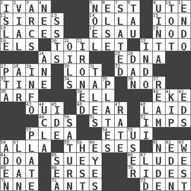 ACROSS 1. "Terrible" tsar 5. A home for chicks 9. Shoshoni 12. Titles for men of rank and authority 14. Rounded earthenware pot or jar 15. Electrically charged atom 16. Shoestrings 17. He sold his birthright 18. Allow head to fall sleepily 19. Raised railways 20. Bathroom plumbing fixture 23. "Tell ____ the Marines!" 24. SW Saudi Arabia district 25. Pulitzer Prize-winning author Ferber 27. Ache 30. Car dealer's back yard 32. Male parent 33. Prong on a fork 34. Fastener 36. Not either 38. Sandy's bark 39. Pipe bend 40. Make supply last 43. Fr. "Yes" 46. Letter starter 48. Put down 49. Music discs 51. R.R. building 52. Naughty children 53. Entreaty 54. Needle holder 56. Silent film actress Nazimova 58. College papers 61. ___ Haven, CT 64. ___ good deed 65. Chop _ 66. Evade 68. Ingest 69. Celtic language 70. Amusement-park features 71. Compass dir. 72. Pismires 73. Gouge DOWN 1. Small island 2. Small bottle 3. Arches 4. Born 5. Christmas carol 6. Otherwise 7. Scheduled 8. The 19th letter of the Greek alphabet 9. National forest in Provo, Utah 10. A blast of a horn 11. Inside; within (prefix) 13. Fast planes 21. Petroleums 22. Pressed 23. _ china 24. A saturated hydrocarbon 26. Daniel's nick name 27. Parent Teacher Association (abbr.) 28. Wind 29. Information 31. Stories 35. Food holders 37. 480, 500 or 516 sheets of paper 41. Monetary unit of Laos 42. Begley and Asner 44. Southern CA. univ. 45. Binary compound 47. Assign a rank or rating to 48. Cards in a Roman deck? 50. Titan orbits this 53. Food holder 55. One who uses or employs something 56. Arabian gulf 57. Grant temporary use of 59. Command 60. Sight organs 61. Naked 62. Genesis locale 63. 270 degrees 65. Ocean 67. Flaplike covering