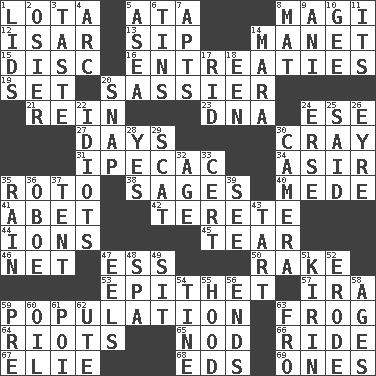 ACROSS 1. Globular water bottle used in Asia 5. _ moment's notice (2 wds.) 8. Wise men 12. Austrian river, tributary to the Danube 13. Small drink 14. French painter Edouard 15. Compact _ 16. Pleas 19. Put into a specified state 20. More lively and spirited 21. It's straight from the horse's mouth 23. Heredity factor (abbr.) 24. Compass dir. 27. 24-hour periods 30. Supercomputer manufacturer 31. Medicinal drug used to evoke vomiting 34. SW Saudi Arabia district 35. Printing process, for short 38. Gurus 40. Ancient Persian 41. Collude with 42. Cigar-shaped 44. Charged atoms 45. Lacerate 46. Fish or hair follower 47. Double-curved letter 50. Immoral or dissolute person 53. Curse 57. Retirement account (abbr.) 59. Census information 63. Toadlike animal 64. Debaucheries 65. Lower and raise head in agreement 66. Travel on an animal 67. Writer Wiesel 68. Begley and Asner 69. Singles DOWN 1. Hats (slang) 2. Flexible twig of a willow tree 3. Clothes sense 4. Curve 5. Toward the sea 6. Airtight sealed metal containers 7. Tenement units (abbr.) 8. Floor covering 9. Black tropical American cuckoo 10. Turn to the right 11. ___ a Wonderful Life 14. Hindu Mythology: god of death 17. To free from 18. Car or cant ending 20. Fastener 22. Foolish or stupid persons 24. Celtic language 25. Expressed in words 26. Jane of fiction 28. Affirmative reply 29. Scram, to a cat 30. Device for capturing images 32. Personal question 33. Sure thing 35. Precipitation 36. Mitch Miller's instrument 37. Portable shelter 39. Observe 43. Small pie 47. Snakelike fish 48. Health resort 49. Be seated 51. Japanese brewing company 52. Eat (away) 54. Prong on a fork 55. Parka part 56. Extremities 58. Grows older 59. Before (prefix) 60. Petroleum 61. Luau course 62. Shoshoni 63. From