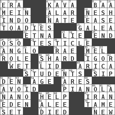 ACROSS 1. Epoch 4. Polynesian shrub of the pepper family 8. Sound made by sheep 11. Chow _ 13. Having or resembling wings 14. Tender 15. _ china 16. Nathan's nickname 17. Comfort 18. Sycophants 21. An organ shaped like a helmet 22. Inactive volcano in Sicily 23. Whopper 25. Conclude 26. Bear (Spanish) 29. A testis 32. White American of non-Hispanic descent 34. Actress Charlotte 35. Cartoonist voice _ Blanc 38. Hero or heavy, e.g. 39. Pottery fragment 41. Russian composer Stravinsky 43. Dripping 44. Hat (slang) 45. N. Chile seaport 46. SAT takers 50. Small drink 51. Lair 54. Mature 55. Ancient Greek god of war 57. Prevent the occurrence of 59. Player piano 63. Billionth: prefix 64. Assist 67. SW Asia republic 68. Locale of original sin 69. Toward shelter 70. Docile 71. Arrange properly for use 72. Passed on 73. ___ Haven, CT DOWN 1. Give off 2. Western Nevada city 3. Opera by Verdi 4. Sunflower state 5. Chicken ___ king 6. Large container 7. "We ___ not amused" (Victoria) 8. Calif. Air Force Base 9. NE Netherlands city 10. Forward in time 12. Connecting point 14. Teachers' org. 19. "Tell ____ the Marines!" 20. Compass dir. 21. Set 23. One who doesn't tell the truth 24. On the rocks 26. Boat paddle 27. Overwhelm 28. Stare at amorously 30. Buy and sell 31. Independent ruler or chieftain 33. Allows 36. The front part of a cuirass 37. Venues 39. A hard, heavy blow 40. Flintstone garb 42. Hit sharply and swiftly 45. At sea 47. Bit 48. Slept 49. Three (prefix) 51. Natives or inhabitants of Denmark 52. Dodge 53. Music written for nine 56. In a ____ (agitated or irritated) 58. Electrically charged atom 60. NW Algerian seaport 61. Unable to walk 62. Afresh 64. Possessed 65. Biblical high priest 66. Area sheltered from the wind