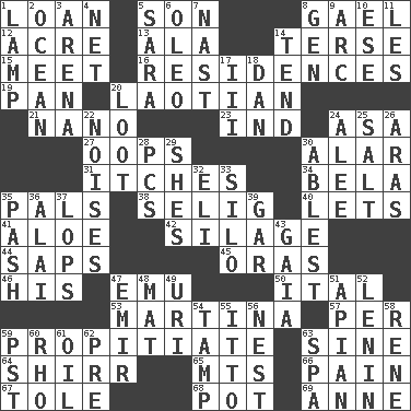 ACROSS 1. Grant temporary use of 5. Male child 8. Highlander 12. 1/640 square mile 13. Wing 14. Laconic 15. Confront 16. Dwellings 19. Baking dish 20. Of or relating to Laos or its people 21. Billionth: prefix 23. Working for oneself (abbr.) 24. White ___ sheet 27. I made a mistake 30. Having or resembling wings 31. Skin irritations 34. Actor Lugosi 35. Friends 38. Former Milwaukee Brewers owner Bud 40. Allows 41. Medicinal plant 42. Fodder prepared in a silo 44. Plant excrements 45. Mouths or openings 46. Part of HMS, perhaps 47. Australian flightless bird 50. Slanted text style (abbr.) 53. Chrissie's court nemesis 57. For each 59. Conciliate 63. Trig term 64. Bake eggs in their shells 65. Mountains (abbr.) 66. Ache 67. Lacquered or enameled metalware 68. Plant holder 69. Singer Murray DOWN 1. Desk light 2. Sea 3. Sports stadium 4. Fish or hair follower 5. "Two Mules for Sister ____" 6. Butter sub 7. Political cartoonist Thomas 8. Commissioned mil. rank 9. Curve 10. Compass dir. 11. French article 14. Watch over 17. One more than two 18. One of the 12 tribes of Israel 20. Plunder 22. Annoying sounds 24. Toward shelter 25. Table seasoning 26. Ancient river in northeast Turkey 28. Personal Computers (abbr.) 29. "______ My Girl" (Turtles hit) 30. Most capable 32. Connecticut Ivy Leaguer 33. Grain storage tower 35. Romantic infatuation 36. Mountain range southwest of Kyrgyzstan 37. Chops off 39. Slender fish 43. Greek goddess of the earth (variant) 47. Arab leader 48. Floor covering 49. RI univ. 51. Bee-related 52. Soviet premier 1918-24 54. Pack (down) 55. "Tell ____ the Marines!" 56. Egg locale 58. French philosopher Descartes 59. Pacific Standard Time (abbr.) 60. 17th letter of the Greek alphabet 61. Lubricate 62. Before (prefix) 63. Health resort