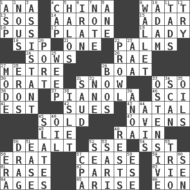 ACROSS 1. Santa ___, CA 4. Large country 9. Electrical Unit 13. Distress signal 14. Composer Copland 15. The sixth month of the Jewish calendar 16. Purulenc 17. Food holder 18. Kenny Rogers chart-topper in '80 19. Small drink 21. Single 22. Insides of hands 24. Sty mamas 26. Actress Charlotte 27. Distance measurement (Brit.) 29. Water vessel 30. Speak pompously 31. Overwhelm 33. Bear (Spanish) 36. Spanish title 37. Player piano 40. _-fi 41. Eastern Standard Time (abbr.) 42. Takes to court 43. Relating to or accompanying birth 45. Disposed of to a purchaser 47. Baking chambers 48. Whopper 49. Precipitation 50. Started a card game 52. Compass dir. 54. Fast jet (abbr.) 56. Part of Q.E.F. 57. Desist 59. Big collection agency 61. To erase 62. Actors' quests 63. Compete 64. Grows older 65. Ascend 66. Period of immesurable duration DOWN 1. Viper 2. Horse sense 3. Helper 4. Head covering 5. Saint headwear 6. SW Asia republic 7. Short letter 8. One (Scot) 9. Place for singles 10. First of billions? 11. Small amounts or degrees 12. Attempt to accomplish something 20. Left side of a ship or aircraft 22. Move like a hungry wolf 23. American Automobile Association (abbr.) 25. Shed a tear 27. Method 28. Greek god of love 29. Expressions of contempt or scorn 31. Saudi Arabian king (1953-1964) 32. Compass dir. 33. Clearly or manifestly demonstrative 34. Glance over 35. Lubricates 38. Small island 39. Small Philippine buffalo 44. Advice 45. Chalkboards 46. Lubricate 49. Musical pauses 50. To draw with force 51. Relaxation 52. Dry up 53. Indian skirt 55. Musical group of three 56. Period 57. Accounting whiz (abbr.) 58. Compass dir. 60. Elected rep.