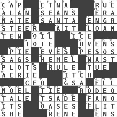 ACROSS 1. Head covering 4. Inactive volcano in Sicily 8. Sorrow 11. Actor Alda or Thicke 13. Seines 15. Epoch 16. Nathan's nickname 17. Before Barbara or Clara 18. Engineer (abbr.) 19. Guide 21. Small island 22. Grant temporary use of 23. Nine, plus one 24. Lubricate 27. Frozen water 29. Carry 30. Baking chambers 34. Sliced dessert 36. Nights before holidays 39. Mexican monetary units 40. Droops 41. Klaipeda city 43. Political cartoonist Thomas 44. Schemes 46. Court order 47. Third day of the wk. 48. Nest on high 49. Hankering 51. Corporate head (abbr.) 53. Girls' org. (abbr.) 54. Pipe bend 57. Christmas carol 60. Standoff 63. Cowboy competition 65. Lie 66. Sadhe (variant) 69. Papal veil 70. ___ a Wonderful Life 71. Fertile tracts in a desert 72. Secret move to avoid paying debts 73. A female animal or person 74. French philosopher Descartes 75. Followers of ems DOWN 1. 2nd pers. sing. pres. of can (arch.) 2. Having winglike extensions 3. Eucharist need 4. Double-curved letter 5. Beverage made from leaves 6. Nanny 7. Opposed to 8. Former U.S. Attorney General Janet 9. Capital and largest city of Mongolia 10. Merit 12. Born 14. Suttee (variant) 18. Veterans Day date 20. Friend of Pooh 25. A whole individual unit 26. Crowbar 28. Police officer (slang) 29. One of the two male reproductive glands 31. Son of Isaac 32. Sense of smell 33. Fast jet (abbr.) 34. Light colored 35. Russian composer Stravinsky 37. Australian flightless bird 38. Major League Baseball Commissioner Bud 40. Health resort 42. Allows 45. Observe 50. Automobile 52. Von Bismarck 54. Peak District village in England 55. Soviet premier 1918-24 56. Plunders 57. Nuclear Threat Initiatives 58. Pledge 59. Otherwise 61. Austrian river, tributary to the Danube 62. Comfort 64. Below a satisfactory level 67. Lair 68. Compass dir.
