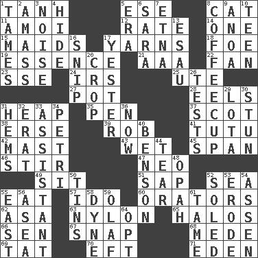 ACROSS 1. Hyperbolic tangent 5. Compass dir. 8. Feline 11. Mine, in Marseilles 12. Assign a rank or rating to 14. Single 15. Unmarried girls 17. Tall tales 18. Enemy 19. Substance 21. American Automobile Association (abbr.) 22. Avid follower 23. Compass dir. 24. Big collection agency 25. Shoshoni 27. Plant holder 28. Snakelike fish 31. Pile 35. Writing instrument 37. Highlander 38. Celtic language 39. Director Reiner 41. Ballerina skirt 42. Vertical spar for supporting sails 43. Dripping 45. Connect, as a bridge 46. Disorderly outburst 47. Modern: prefix 49. Be seated 51. Plant excrement 52. Ocean 55. Erode 57. Wedding promise 60. Speakers 62. White ___ sheet 63. Thermoplastic polyamide 65. Saint headwear 66. Elected rep. 67. Fastener 68. Ancient Persian 69. Make lace 70. Bank Draft (abbr.) 71. Locale of original sin DOWN 1. Corrects by punishment or discipline 2. Collect or gather 3. Annoying sound 4. Flintstone garb 5. Period 6. "Two Mules for Sister ____" 7. Inactive volcano in Sicily 8. Java holder (2 wds.) 9. Small Philippine buffalo 10. Adolescent 13. Son of Isaac 16. Sever or remove by pinching or nipping 17. Last past 20. Riding implement 26. Trials 29. Globular water bottle used in Asia 30. Make senseless or dizzy 31. Cloth borders 32. Part of Q.E.F. 33. Helper 34. _ dish (used to culture cells) 36. Immediately 40. Gillaume's butler role 44. Rend 48. Brightly colored fish 50. Metal containers 52. Having a sole or soles 53. Eat (away) 54. NE Netherlands city 55. Compass direction 56. Toward the sea 58. Centimeter-gram-second unit of force 59. Norwegian king 61. Not wild 64. Choose